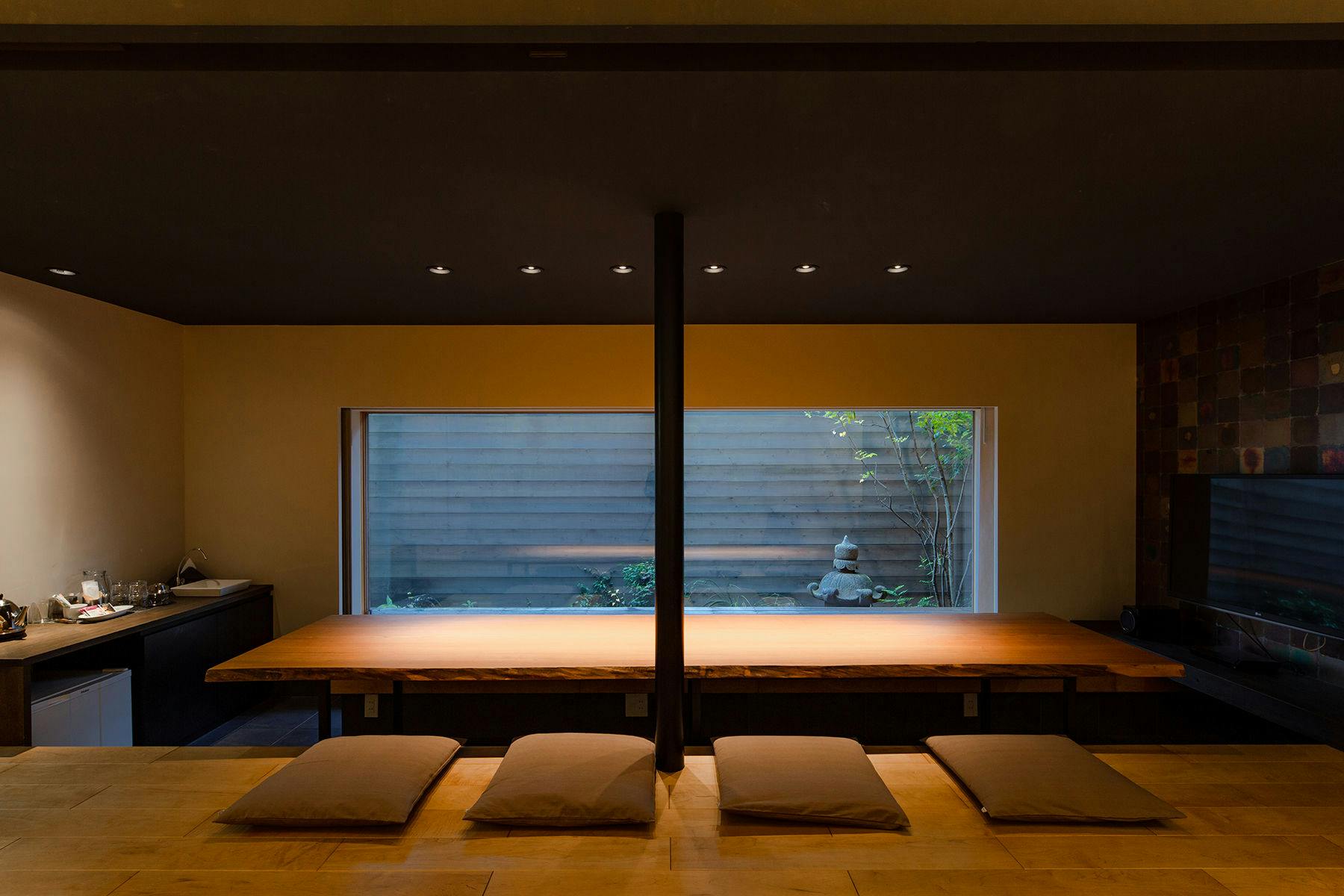 「向かい合う部屋」をコンセプトに大きなテーブルと茶室をイメージした印象的な壁面。