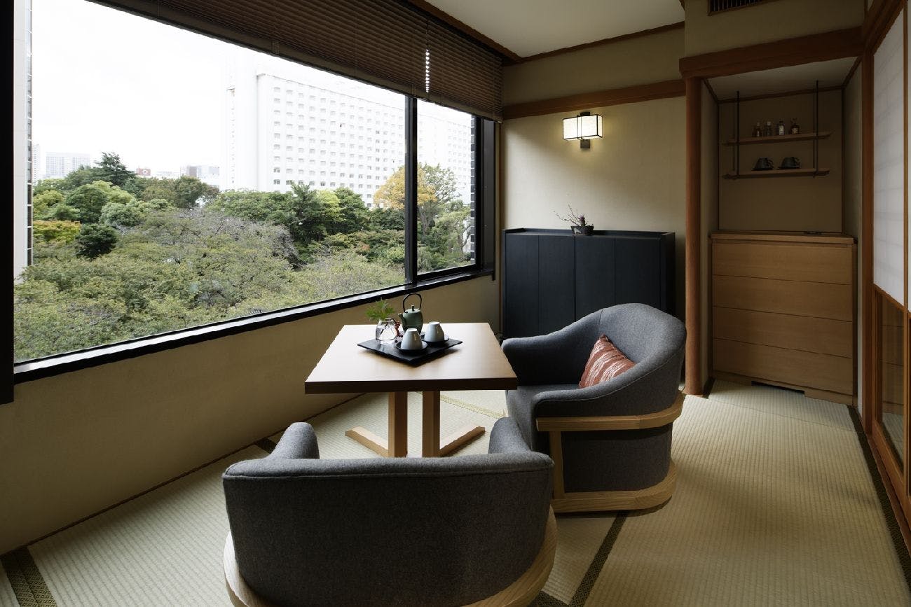 季節ごとに表情を変える日本庭園を窓一面に望むことができるお部屋です。伝統的な和の設えを重視した空間に、外国のお客さまや年配のお客さまにもごゆっくりとおくつろぎいただけるようローベッドやソファを採り入れております。やわらかい色調のお風呂は湯船と洗い場が分かれており、ゆったりとお入りいただけます。高輪 花香路にご宿泊のお客さま専用のラウンジではくつろぎのときをお愉しみいただけます。