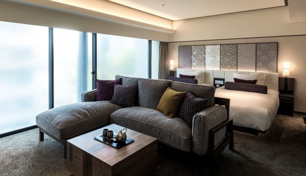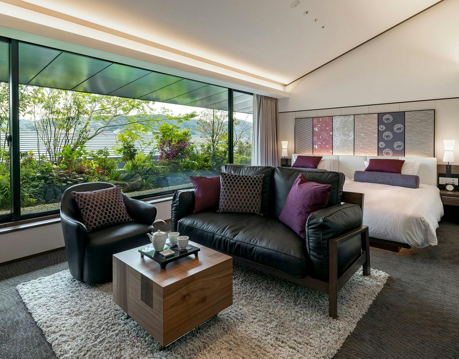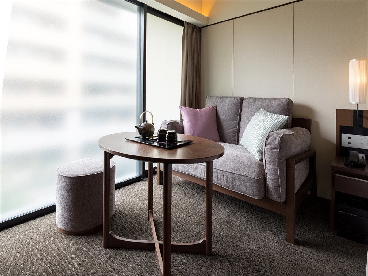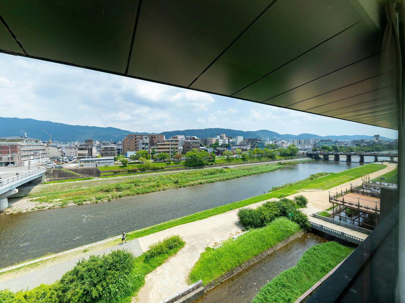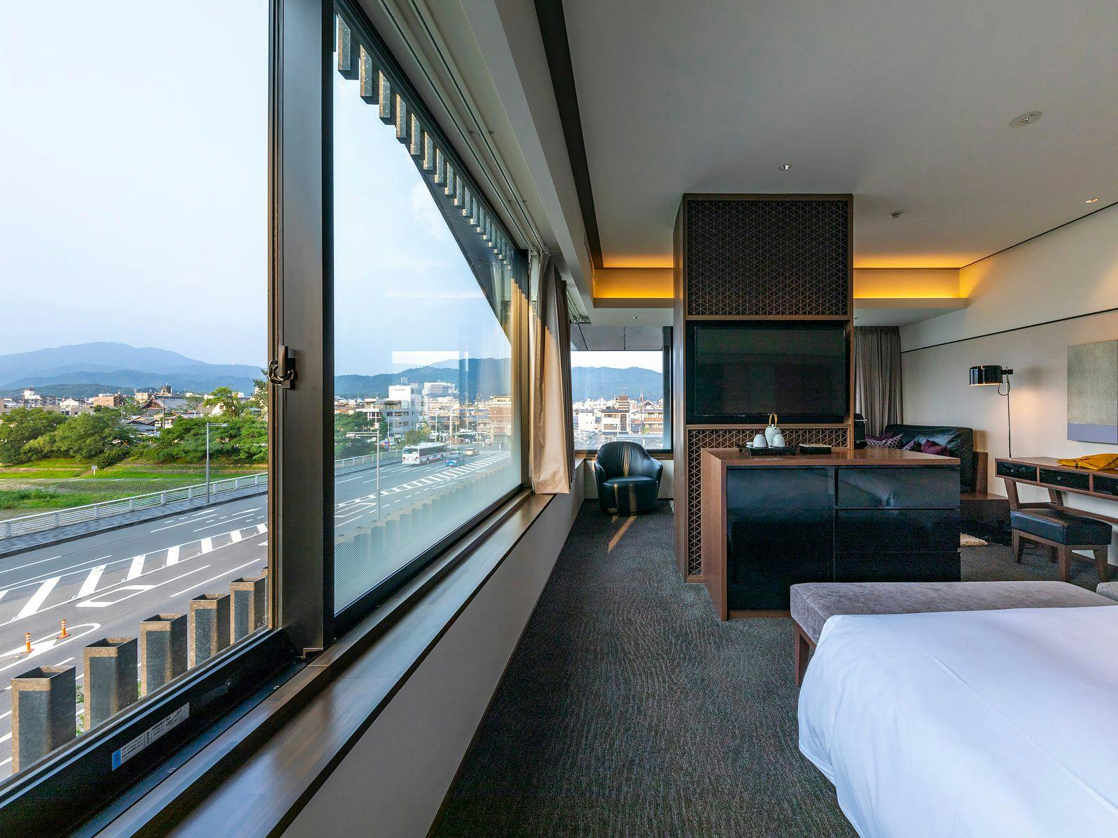 鴨川沿いのコーナールーム鴨川スイート。大型窓からは鴨川だけでなく山並みを一望でき、京都の自然の景色をお楽しみいただける贅沢なお部屋です。※客室は全て禁煙です(館内に喫煙スペースあり)
