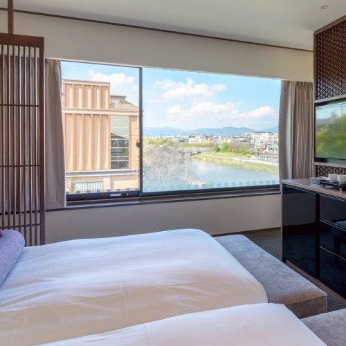 お部屋から鴨川がご覧いただける当ホテル自慢の鴨川ツイン。京都の四季の移ろいをご堪能ください。※2019年12月1日より部屋タイプ名を変更いたしました。※客室は全て禁煙です(館内に喫煙スペースあり)