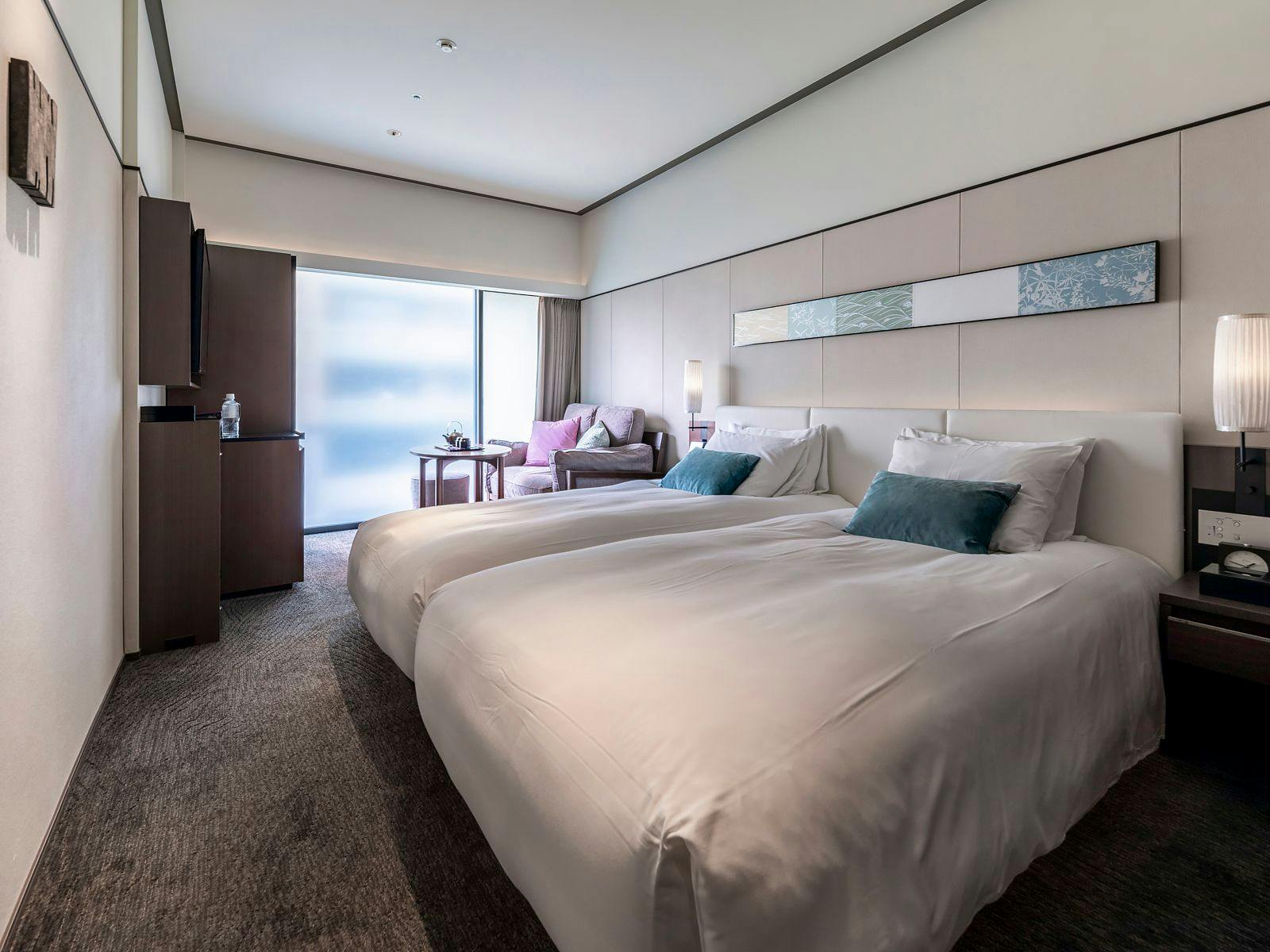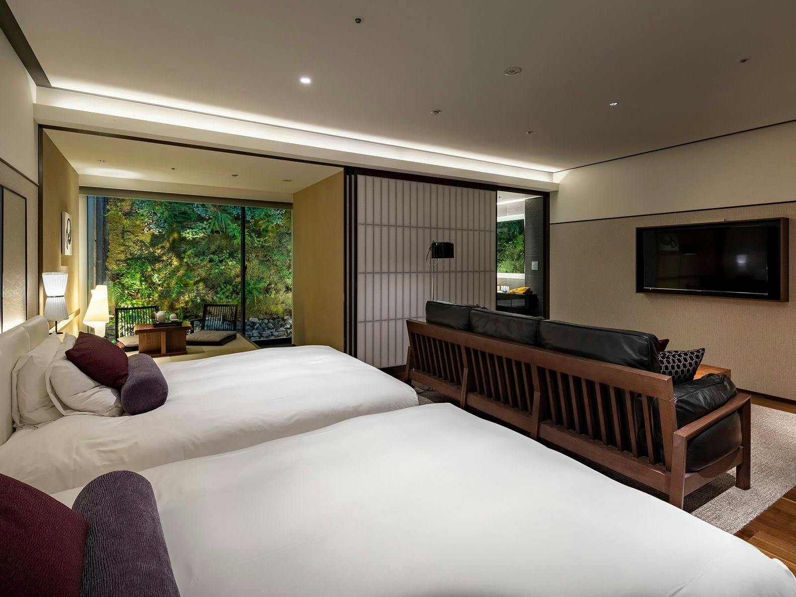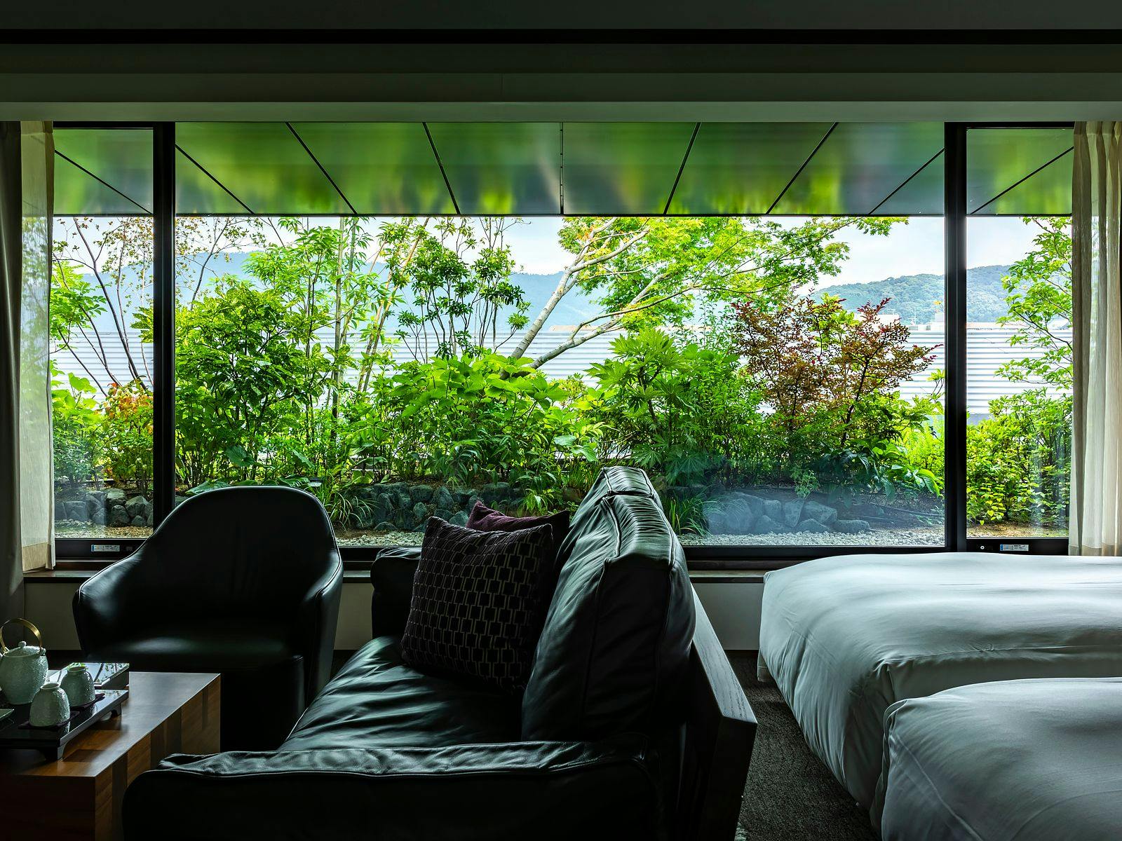 東山の山並みが一望できるエグゼクティブツイン。自然の四季の移ろいをお楽しみいただけます。※客室は全て禁煙です(館内に喫煙スペースあり)