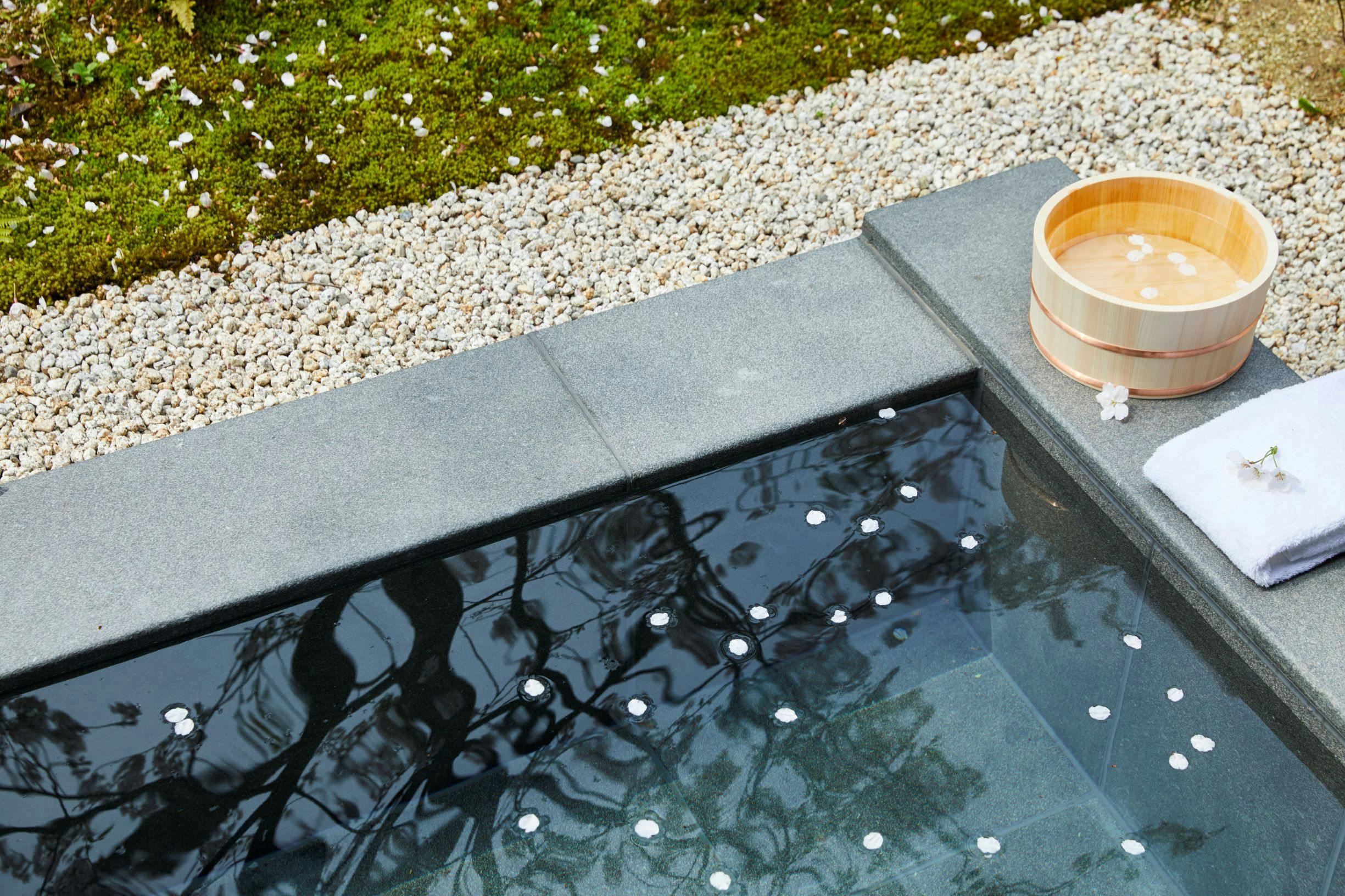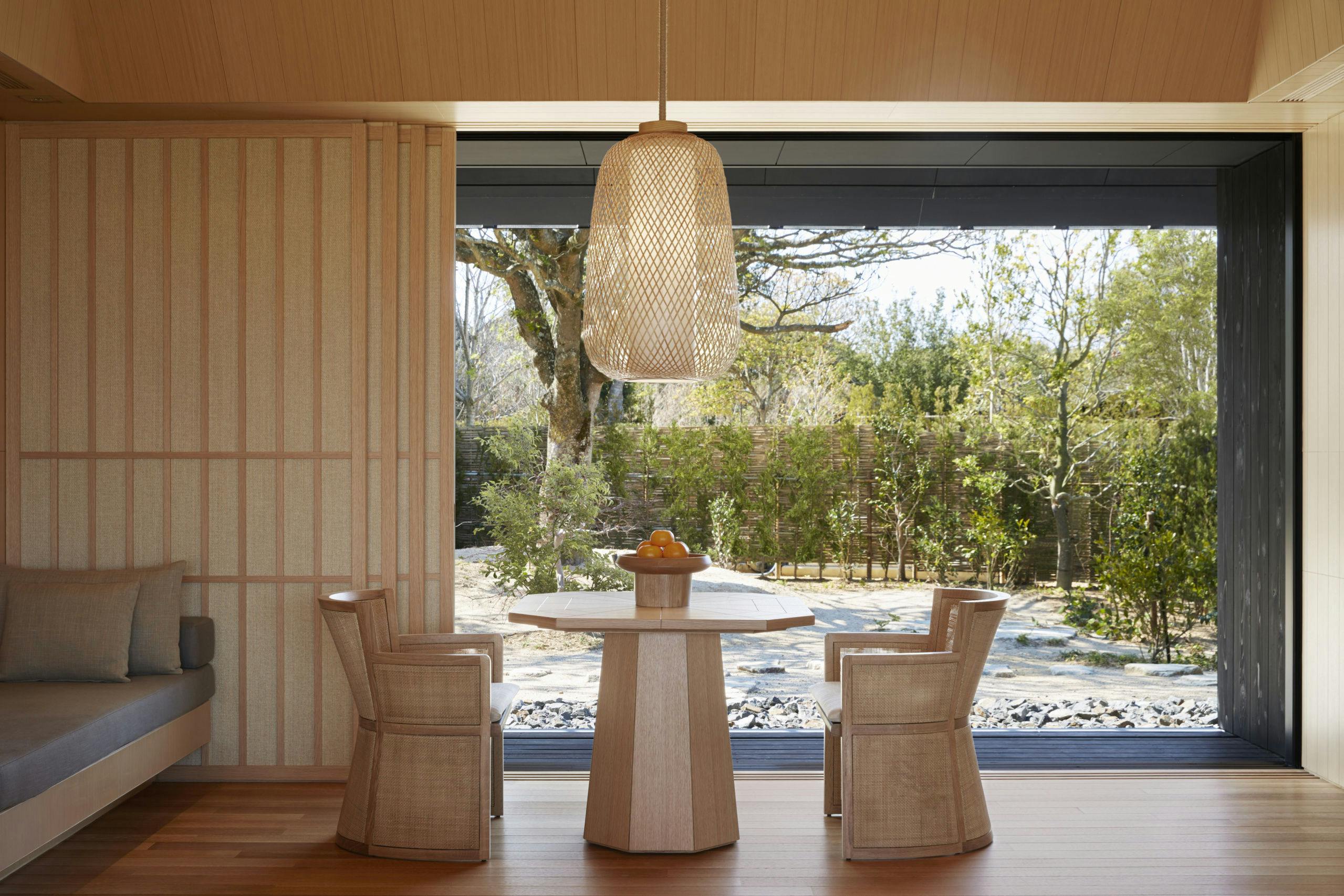 伊勢志摩国立公園内の緑豊かな庭を眺めるツキヴィラは、ダイニングも楽しめる広々としたベランダを通して、室内も屋外も楽しめるよう設計されており、室内からもその自然をご満喫いただけます。また、庭には、露天風呂と内湯の両方を備えたプライベートの温泉棟があり、温泉ウェルネスが自慢のアマネムの中でも、さらに温泉三昧を心ゆくままに堪能できるヴィラです。他のヴィラやスイートからも離れた場所にあるため、より静寂さや自然を感じられ、開放的で心地よい時間を過ごすことができます。リビングダイニング、キッチン、スイートと同じ広さ・仕様のベッドルームを備えています。縁側に面した大きな窓を開け放つと、目の前に広がる自然豊かな庭と自然林との一体感を四季を通じてお楽しみいただけます。