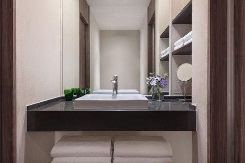 静かな谷の様相を表す“深山(みやま)”をコンセプトに、暮れゆく美しい時に見られる山々の稜線と、輝く朝霧の艶を表現したオリジナルアートワークが印象的なお部屋です。コネクトルームのご用意もございます。