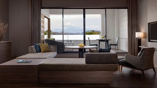 天城連峰を望む温泉露天風呂付きスイートルーム。83.2平米の広さを誇り、自然と調和した上質なリビング空間と寝室空間を兼ね備えています。ワンランク上のリゾートライフに相応しい時間をお過ごしいただけます。