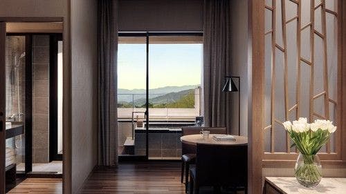 日本百名湯の一つである修善寺温泉をお部屋に引きこんだ贅沢な空間。森の奥深さを表す“深山(みやま)”をコンセプトに、暮れゆく山々の稜線と、輝く朝霧の艶を表現したアートワークも印象的です。