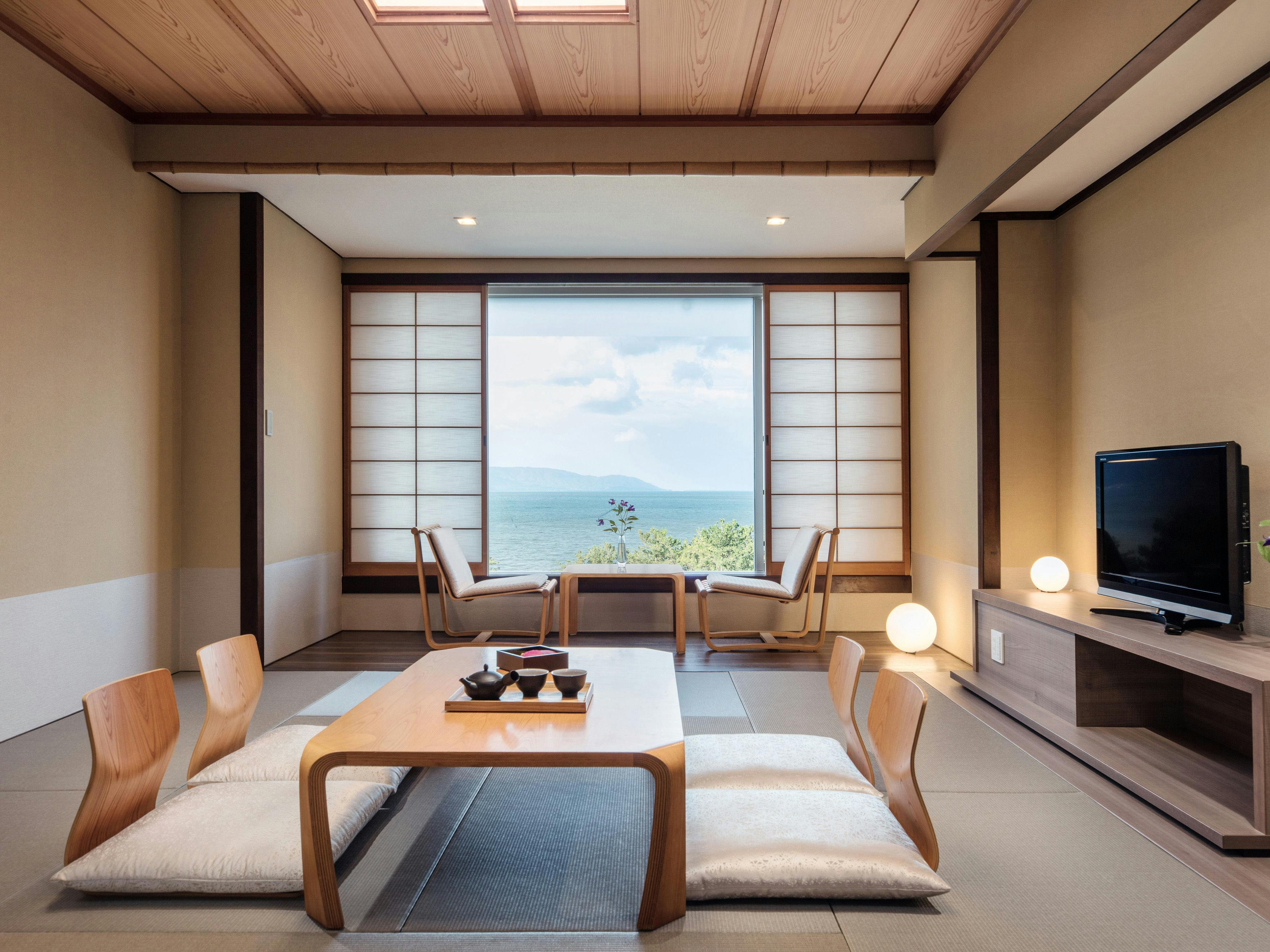 琵琶湖をのぞむゆとりある空間。月明かりにてらされた湖をイメージした落ち着いた色合いでまとめられた客室で