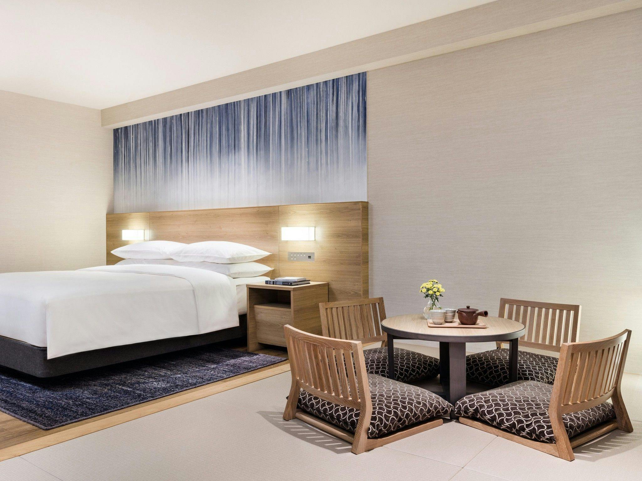 畳のくつろぎとベッドの寝心地を一部屋で。ブルーの色使いが木目調のインテリアに表情を与えています。