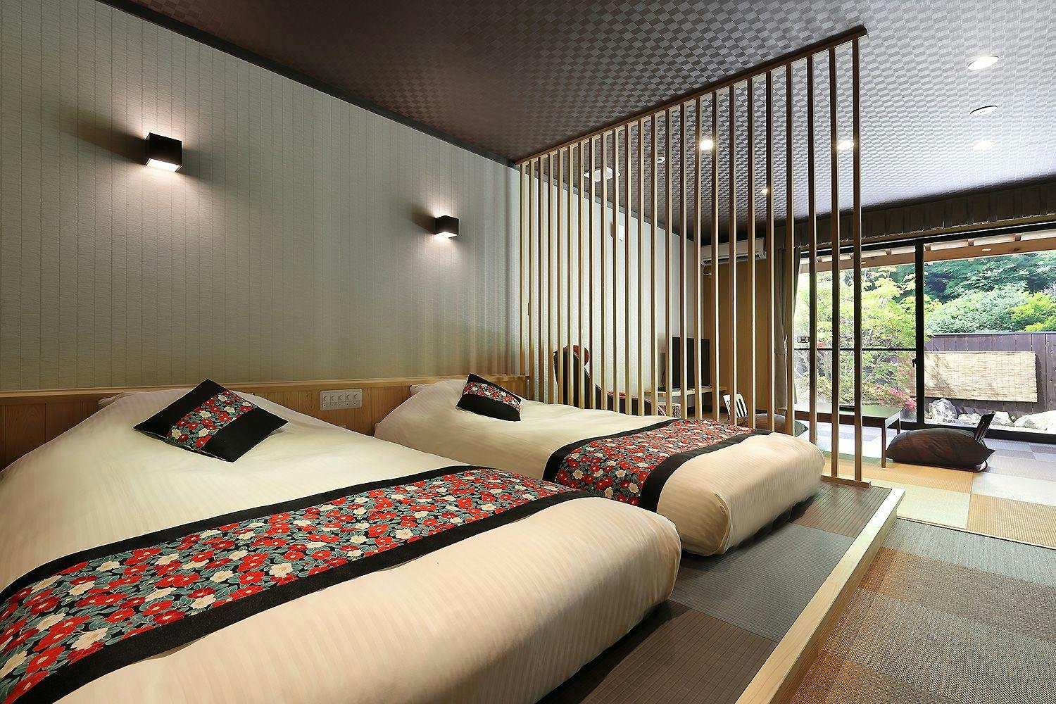2階:シモンズ製ベット・シャワーブース・パウダールーム・半露天風呂・トイレ