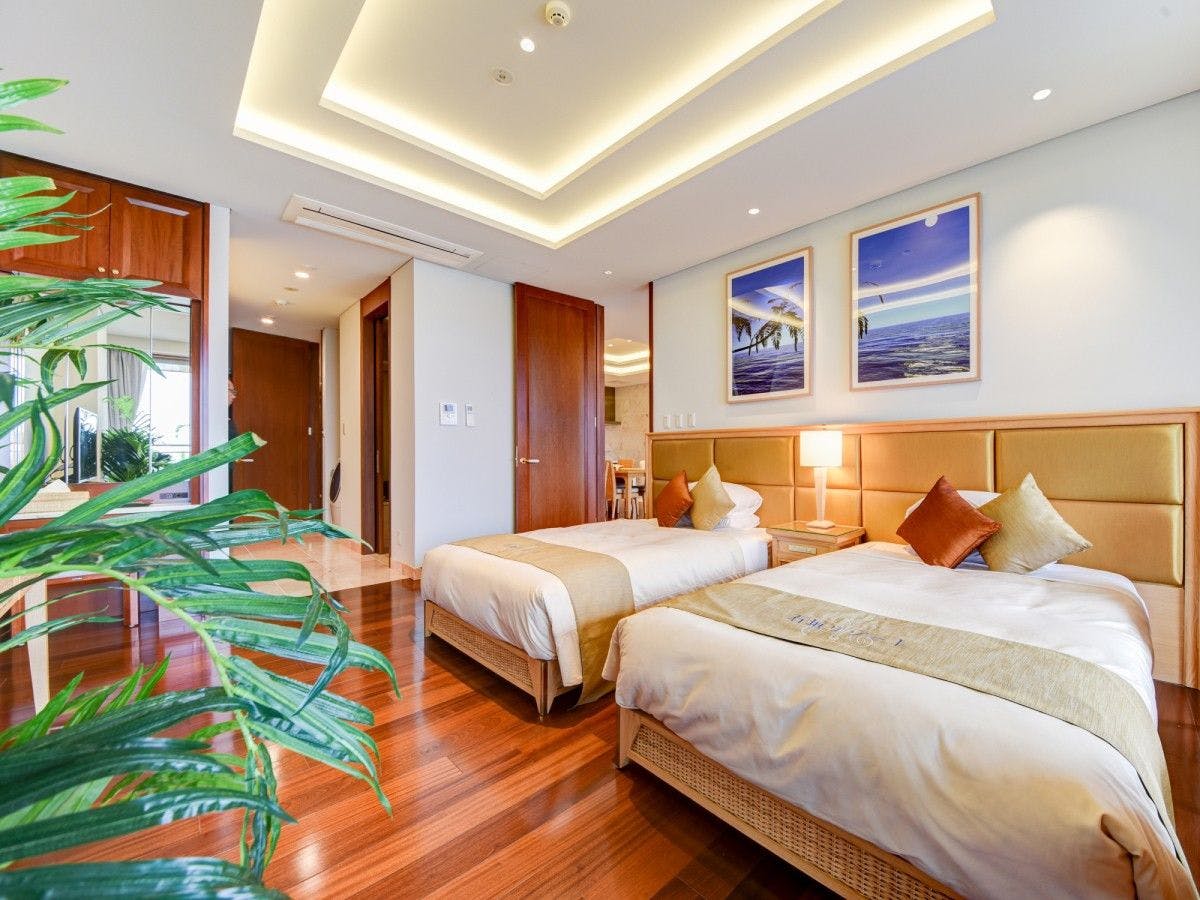 お客様のくつろぎを演出する、広々LDKとツインタイプのベッドルームが2部屋、バスルーム完備。ベッドルームはバルコニー側と玄関側に1部屋ずつあり、4名様でもゆったりとおくつろぎいただけます。バルコニーからは東シナ海の美しい景色を一望できます。他では味わえない優雅な空間でゆったりした時間をお過ごしください。