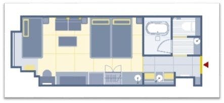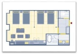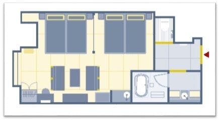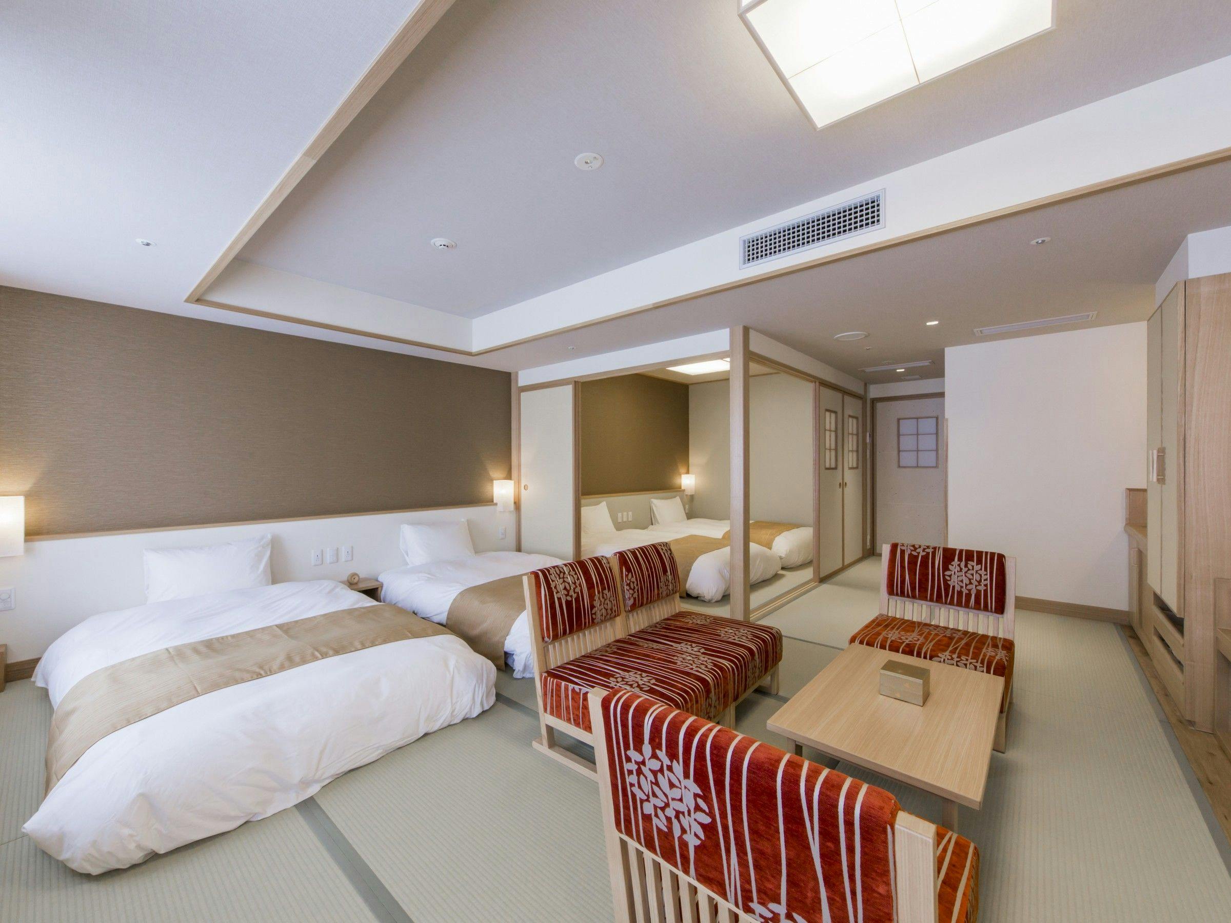 全室角部屋で、40平米あるゆとりの空間にハリウッドツインタイプの和ベッドを2組並べた4名定員のお部屋です。