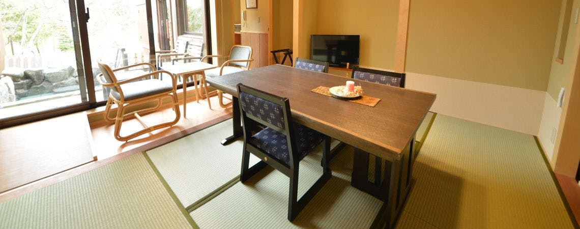 【日本庭園が見渡せる純和風の客室】客室にお風呂のご用意はございませんが、使用している木材にこだわった落ち着いた和室になっております。貸切温泉にも近いので大変便利です。※フロントからは少し距離がございます。■ナノイーによる24時間空気清浄・除菌■禁煙■室内着として浴衣、作務衣、パジャマ■洗浄機付トイレ※貸切風呂(45分)無料付:当日フロントにてお申し込みください。(ご希望の時間に添えない場合があります。ご了承ください。)