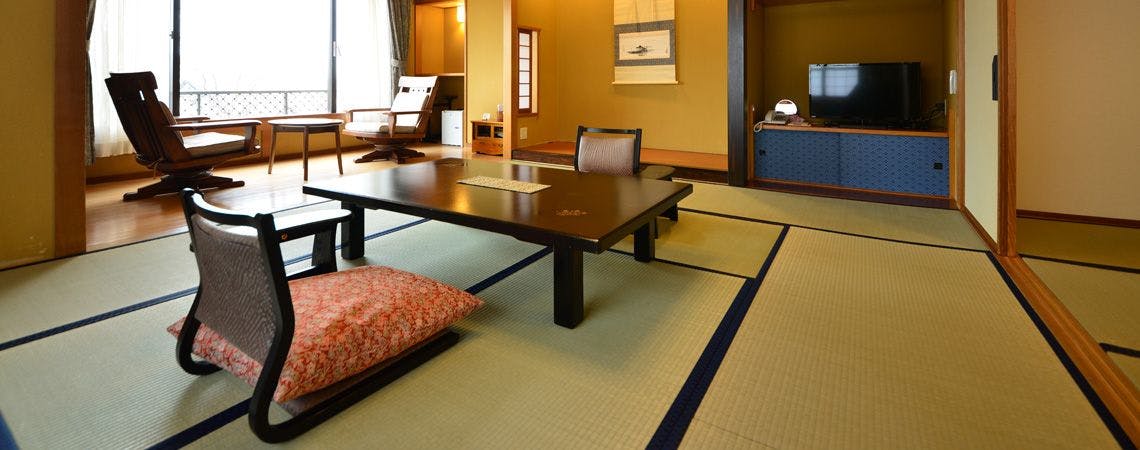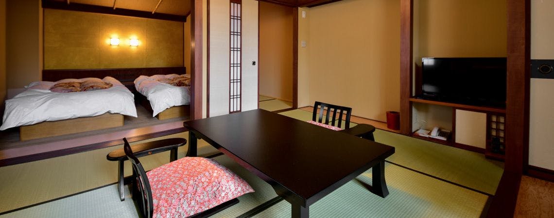露天風呂付特別室 全2室・フロントそばの2階になります(階段が近いですが、少し離れた場所にエレベーターもございます)・広さはゆとりある本間10帖+3帖とツインベッド2台の寝室部屋になっております。・岩露天風呂とシャワールームを完備。・マッサージチェアと広い空間を持つ贅なる空間です。・お部屋は禁煙になりますので喫煙スペースをご利用下さいませ。