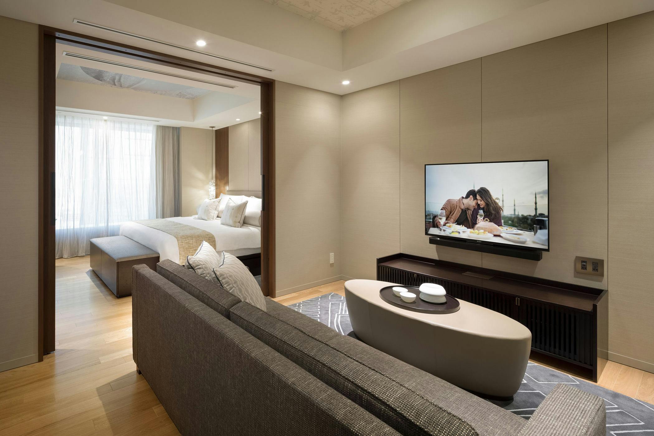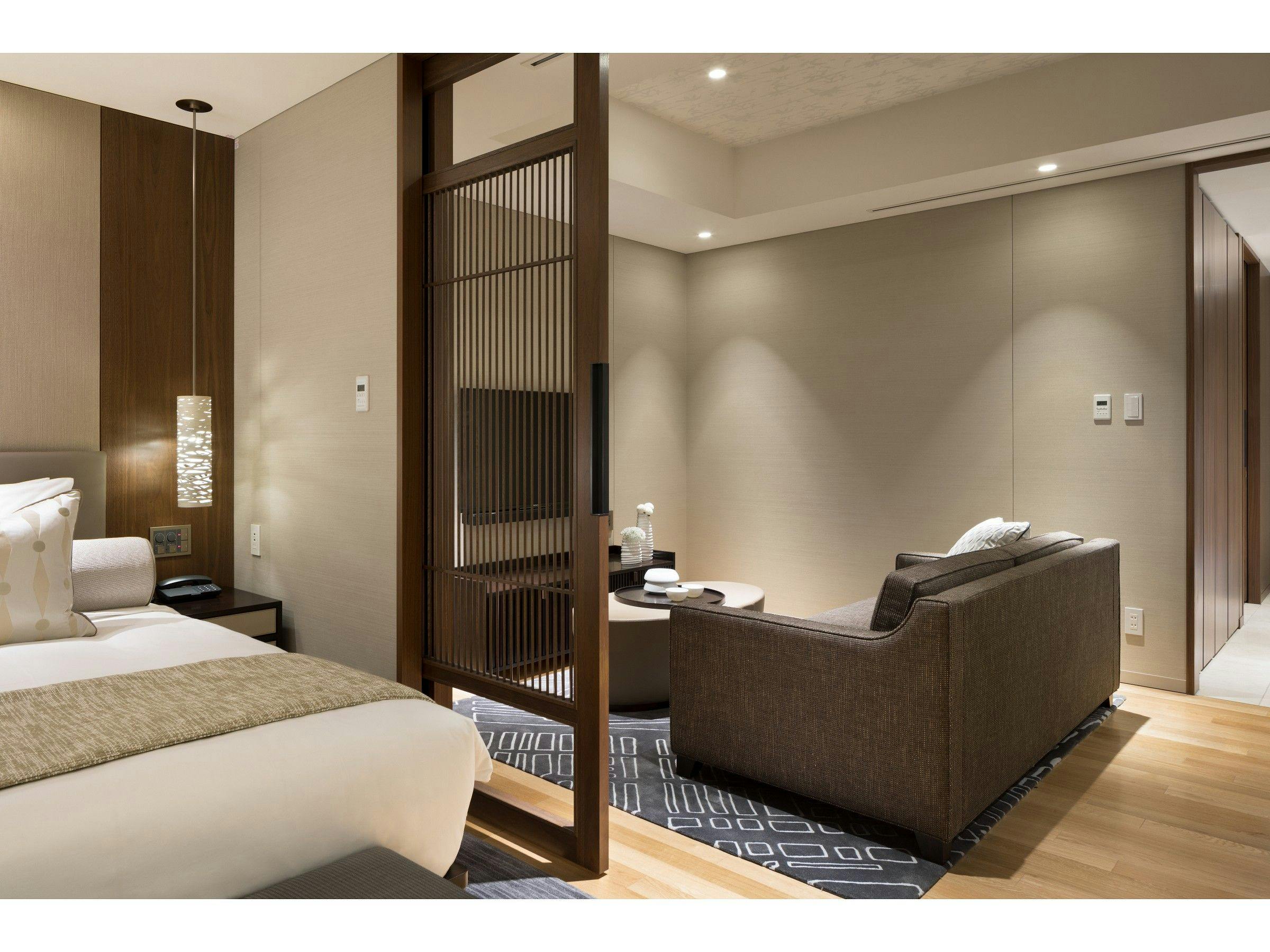 91平米の広々としたお部屋には、ベッドルームにキングベッド1台、ウォークスルークローゼット、独立したバスルーム、シャワールームを備えています。リビングエリアに隣接する畳スペースに備え付けの布団を敷くことで、4名様までご利用可能です。(エキストラベッド(追加料金)ご利用の場合最大5名様)