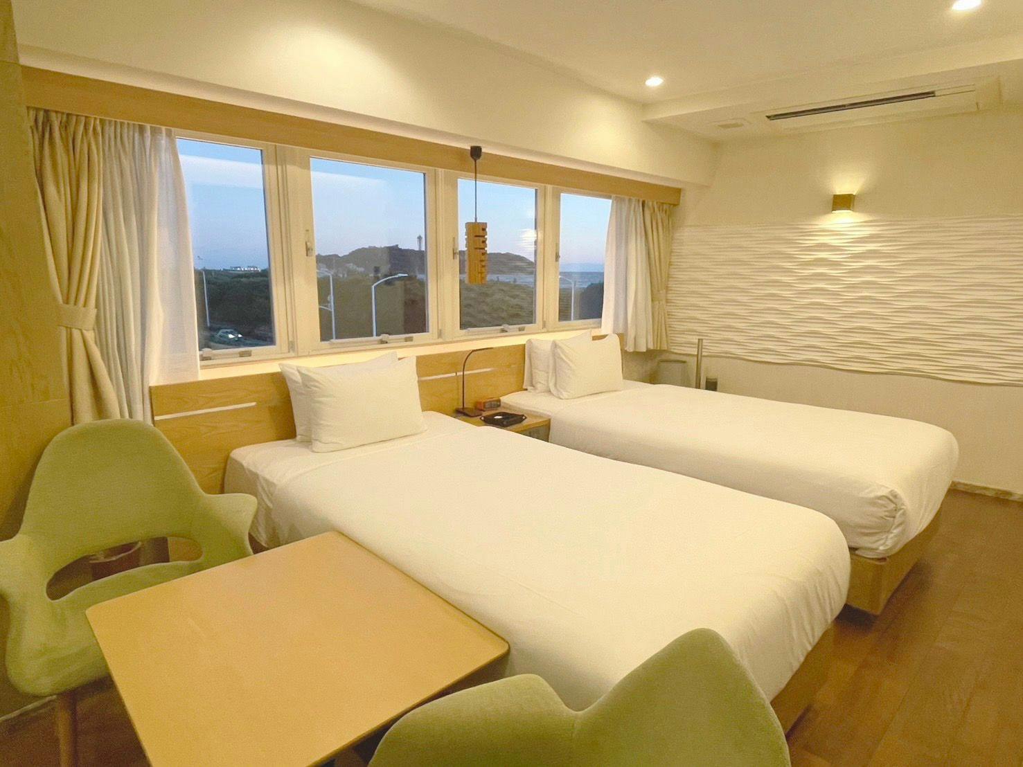 江の島と相模湾、晴れた日には富士山を眺めることの出来る4階にございます広さ27平米のオーシャンダブルルーム。開放的な空間で自慢の浴室とリラクゼーションをお楽しみください。※お部屋の形状、窓の位置などはお部屋によって異なります。予めご了承ください。