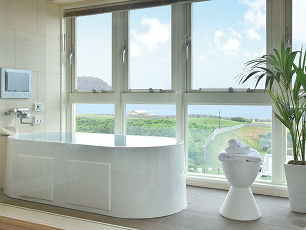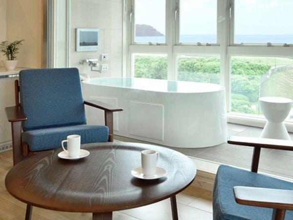 江の島と相模湾、晴れた日には富士山を眺めることの出来る4階にございます広さ29平米のグランドオーシャンダブルルーム全2室。開放的な空間で自慢の浴室とリラクゼーションをお楽しみください。※お部屋の形状、窓の位置などはお部屋によって異なります。予めご了承ください。
