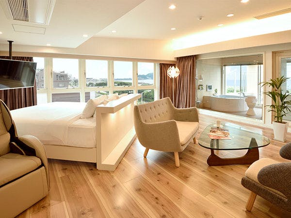 江の島と相模湾をパノラマで眺めることの出来るオープンデッキ、展望風呂、プレミアムスイートのみに設置したサウナ、湘南の自然の恵みと最上のホスピタリティでくつろぐ空間をごゆっくりとお過ごしください。