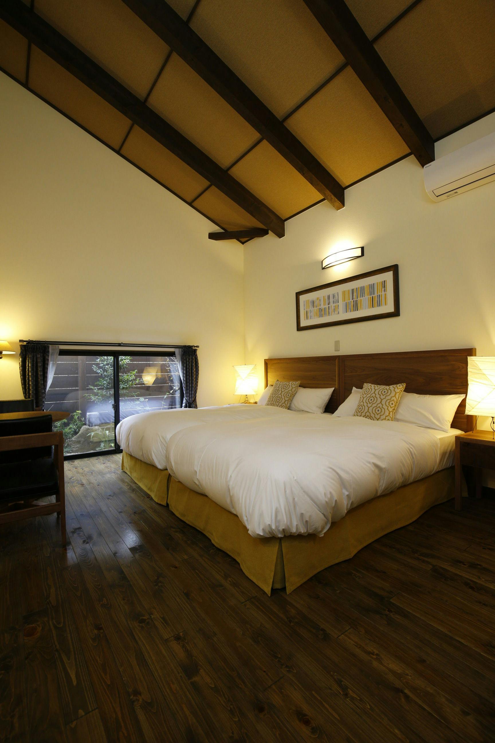 各コテージ由布岳を真正面に構え、由布院の町を一望できる好立地にございます。寝室は、ゆったりとおくつろぎいただけるようにハリウッドツインをご用意。お風呂は2タイプあり、檜の香りが香る檜の内風呂、由布岳を見ながら信楽焼の露天風呂をご用意いたしました。どちらも源泉かけ流しのため、由布院の湯をお楽しみ頂けます。