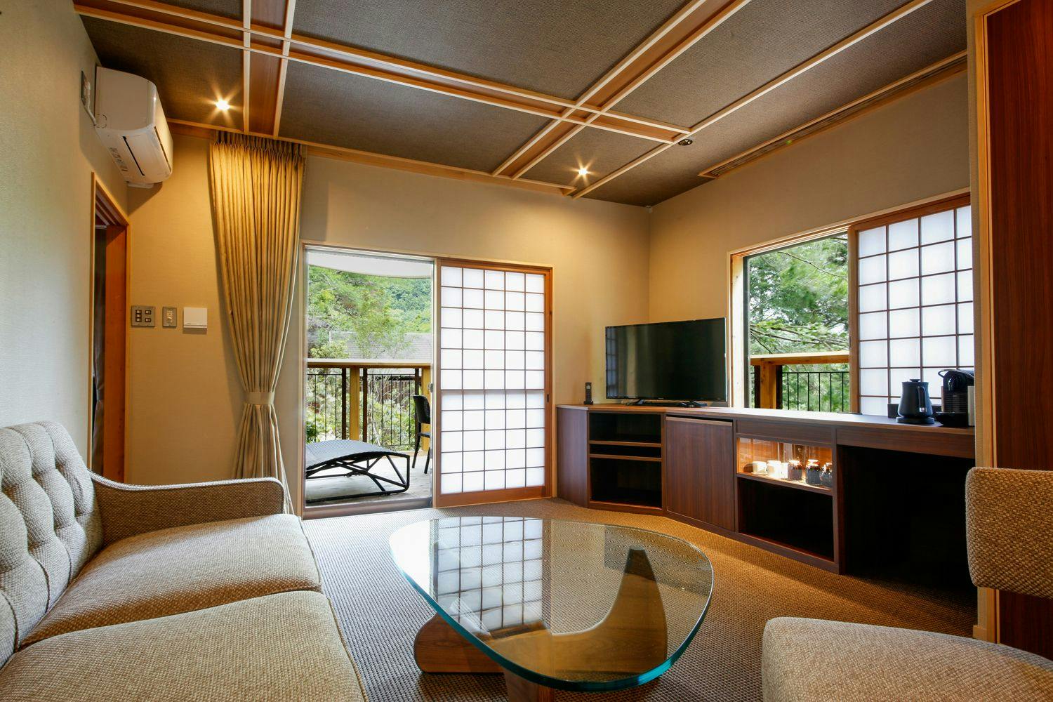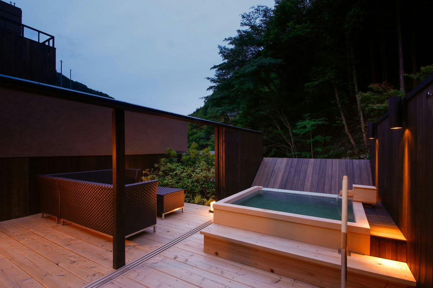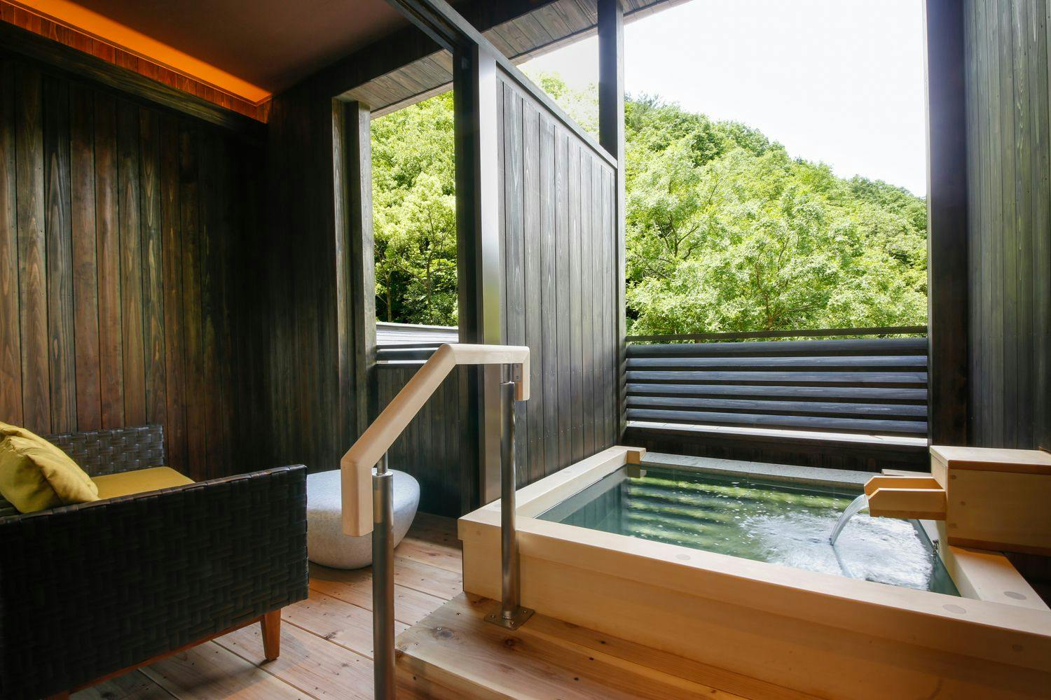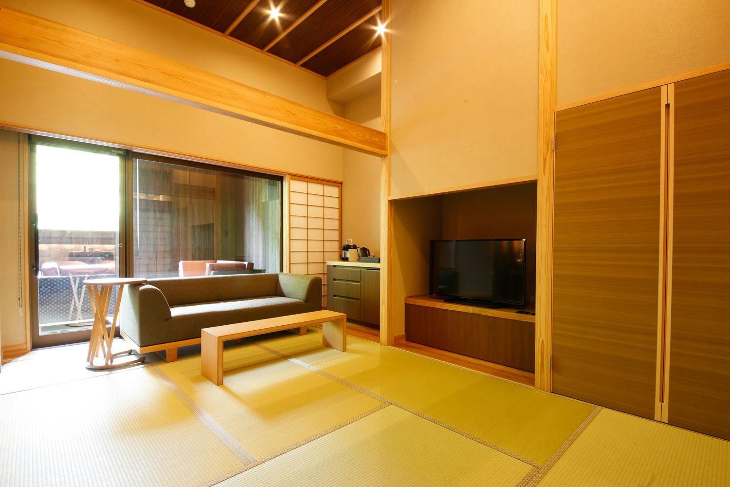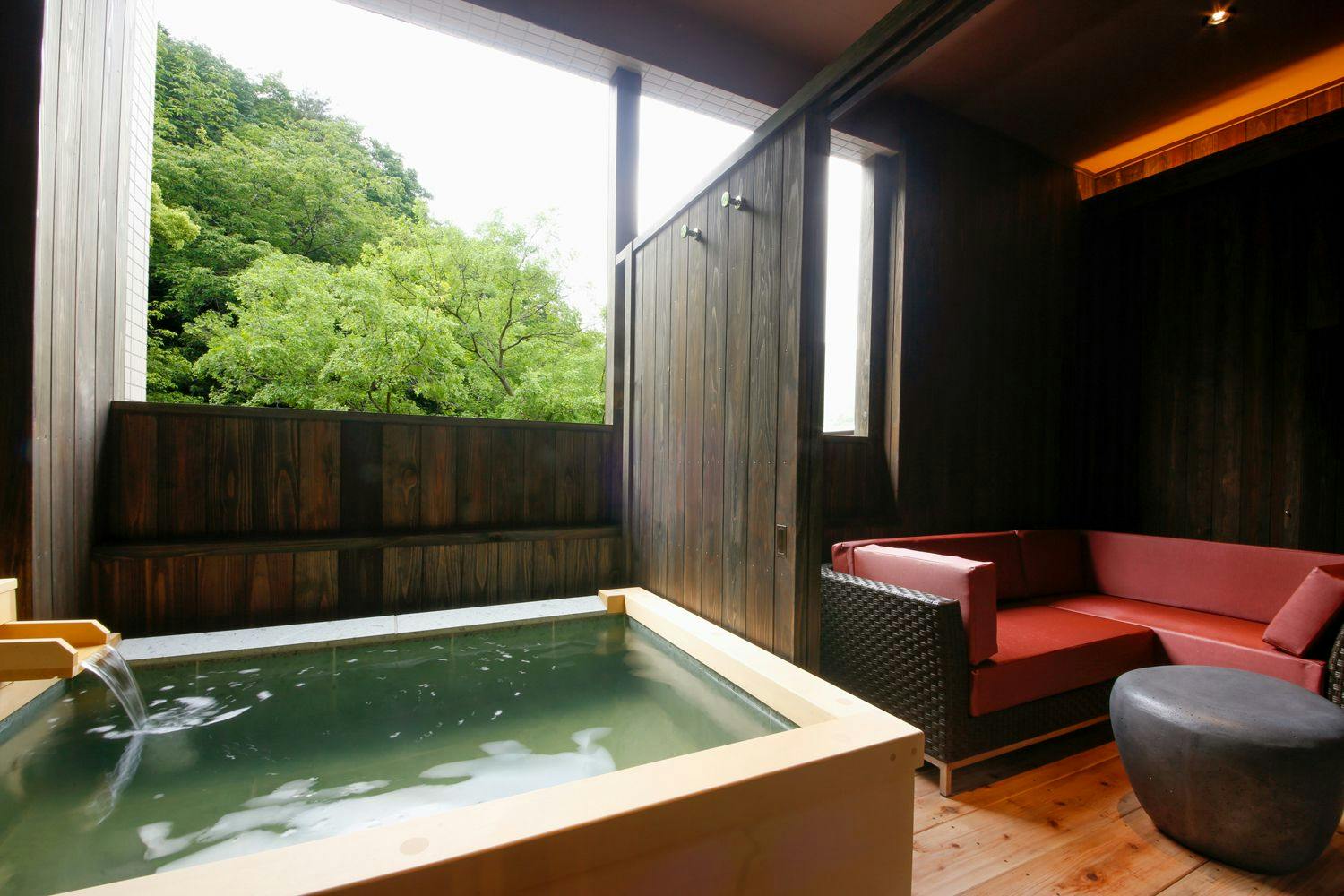 温泉露天風呂、独立型シャワーブース、洗浄機付トイレ、薄型液晶テレビ、TV接続用メディアハブ(USB・Bluetooth・HDMI)、インターネット接続無料(Wi-Fi)、電話、冷蔵庫(ミニバー)、コーヒーメーカー、電気ケトル、エアコン、加湿空気清浄機、ドライヤー、セーフティーボックスなど