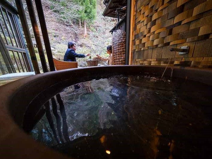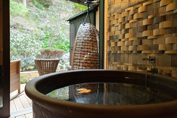 ■お部屋に備え付けられたお風呂には特注の信楽焼きの湯船を用意し、半露天としてご利用いただけるよう工夫をしております