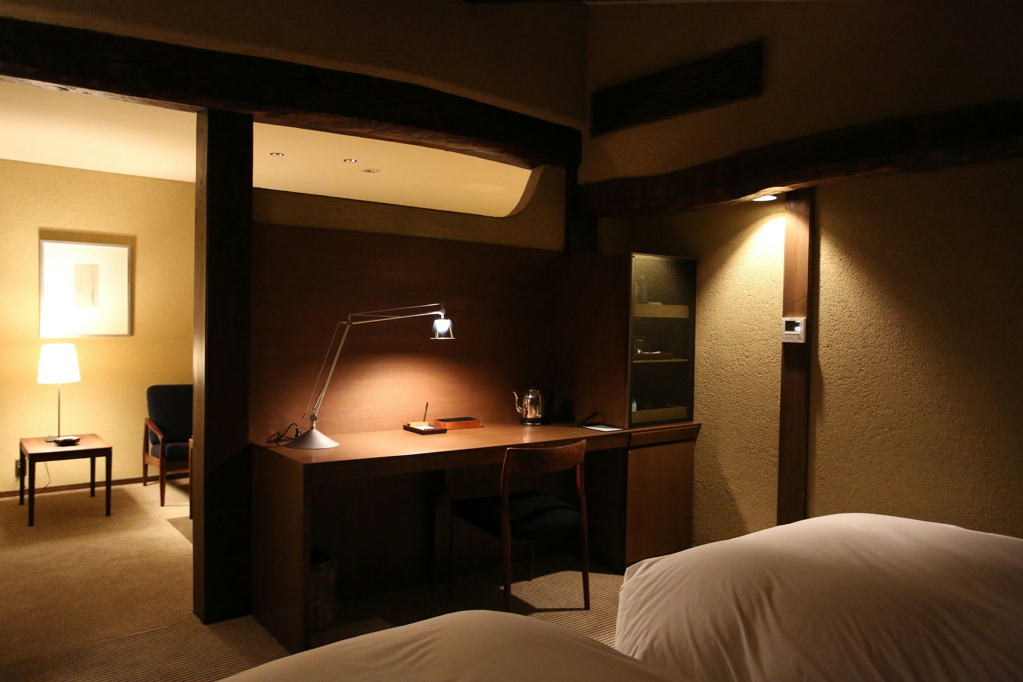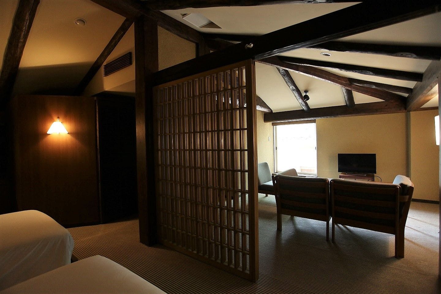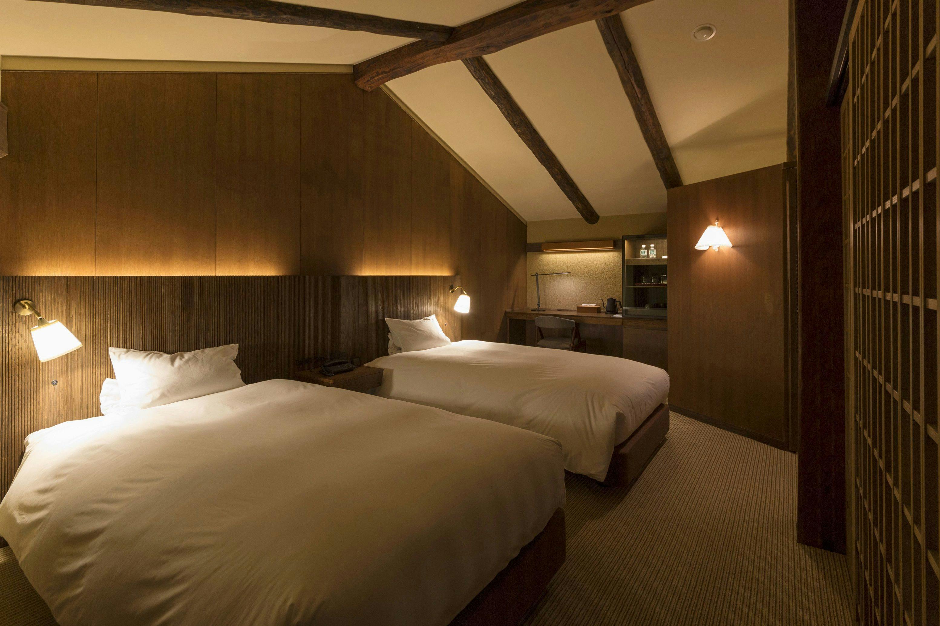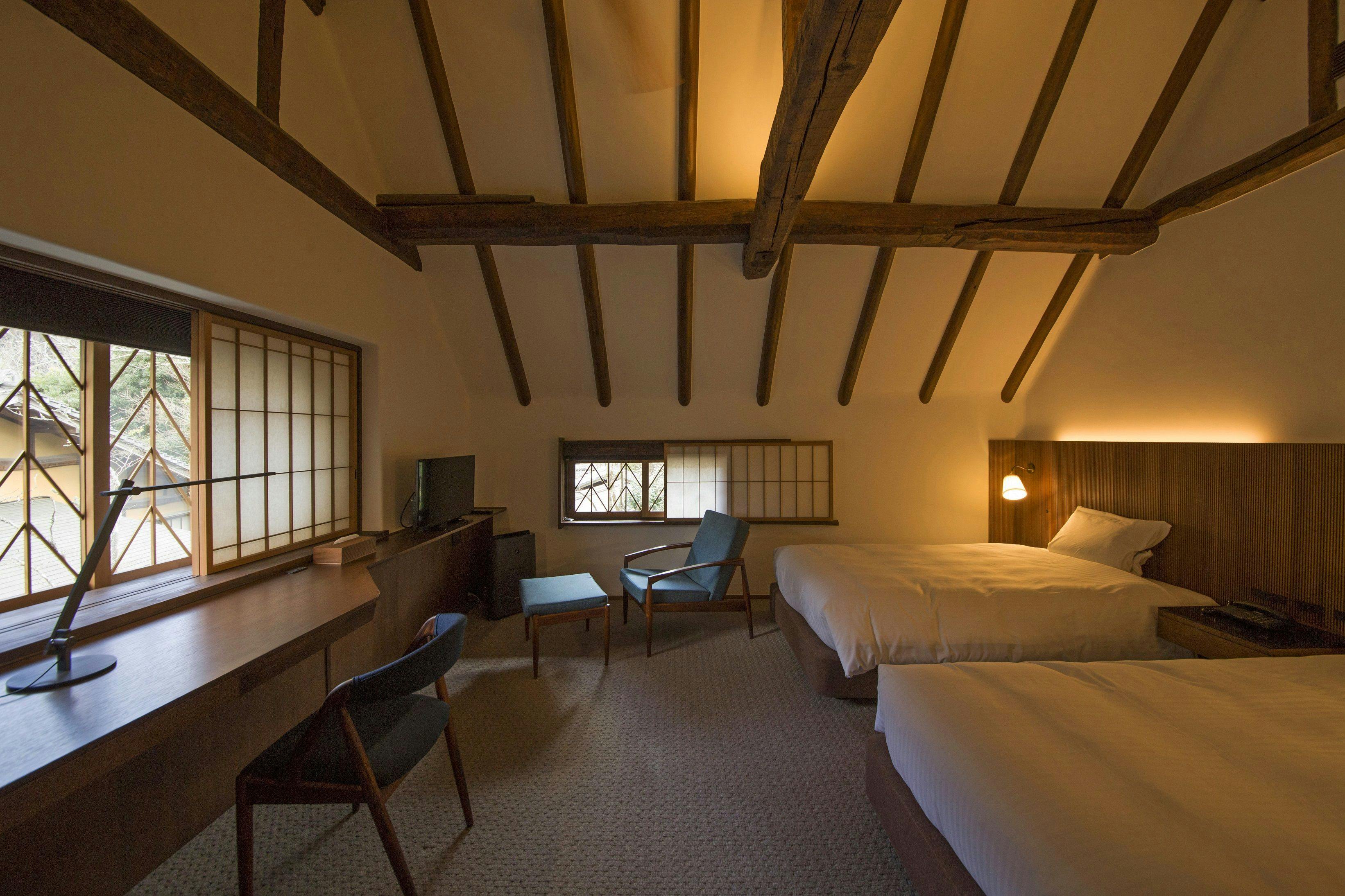 2016年12月リニューアル本館1階、古材を活かした大きな梁が“隠れ家”の趣をもつツインベッドルーム。お食事は館内のレストラン「蛍火園」にてご用意いたします。 ※洋室へのご宿泊は中学生以上の御客様に限らせていただいております。