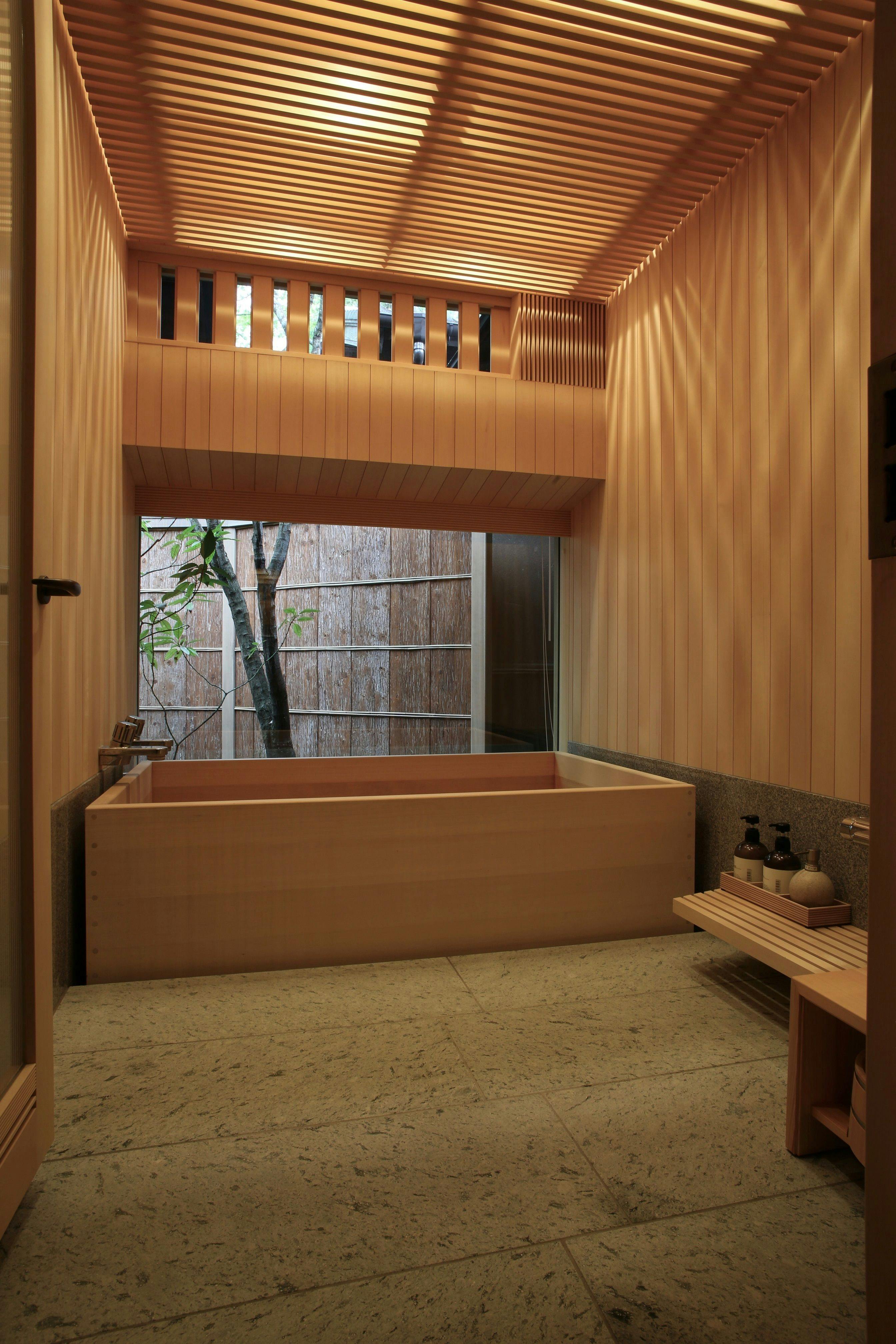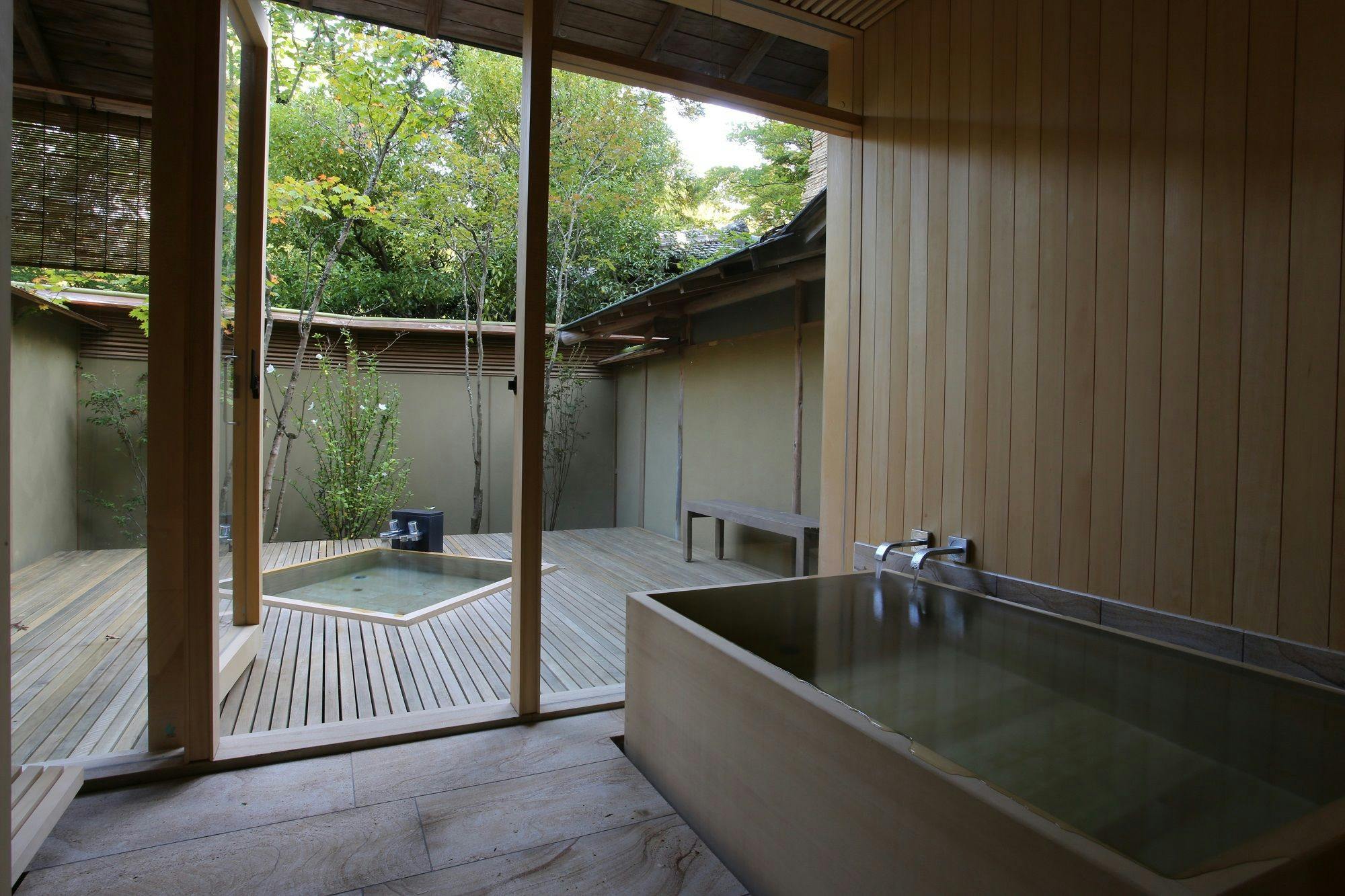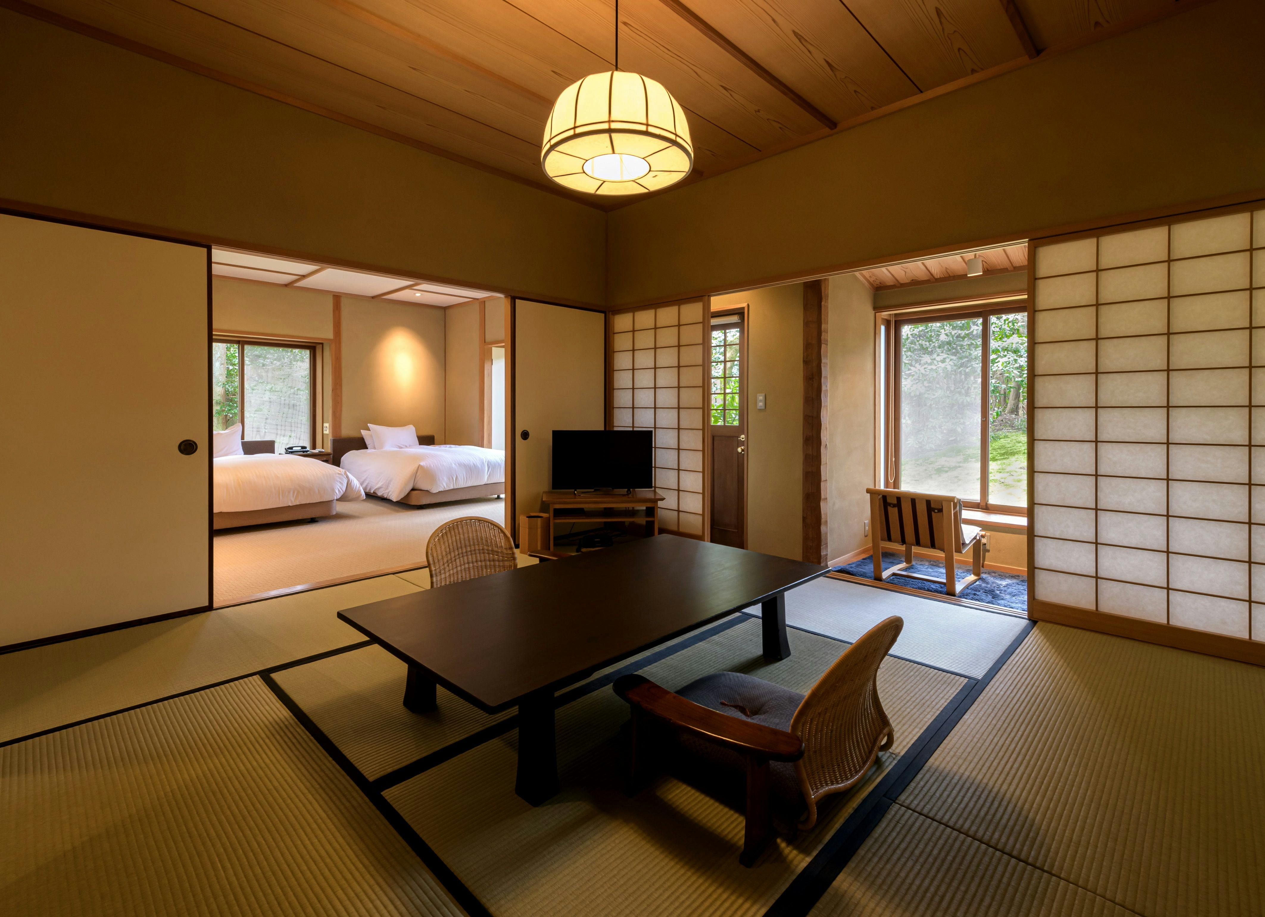 離れの中で最も奥に位置し、静かにお過ごしいただけます。和室の居間とツインベッドの寝室、半露天の内風呂からは庭の緑をお愉しみください。