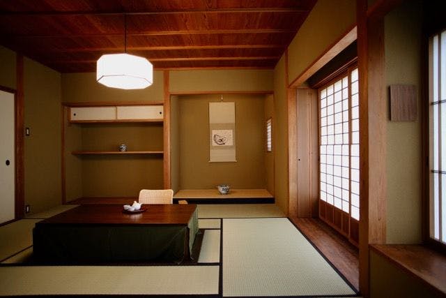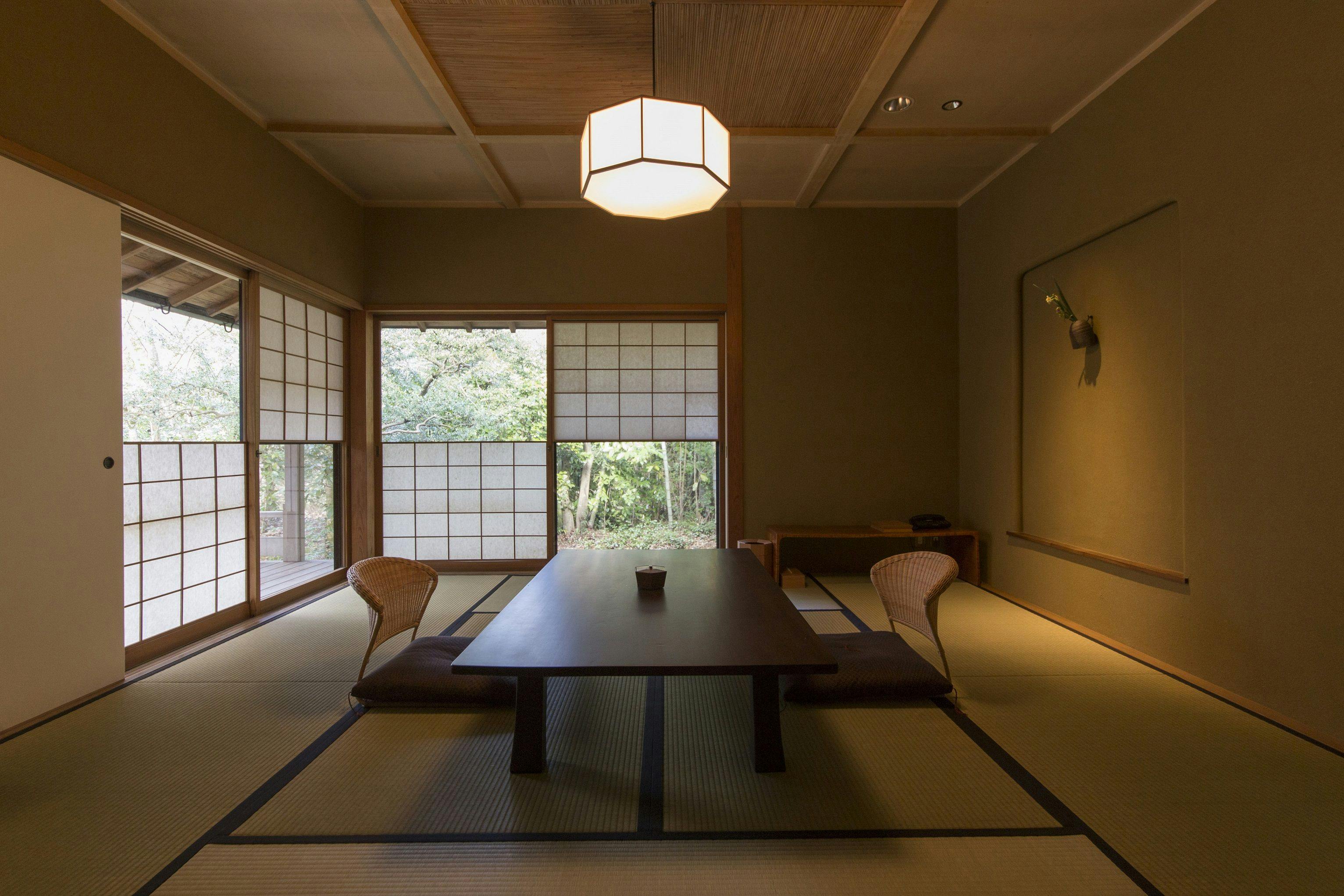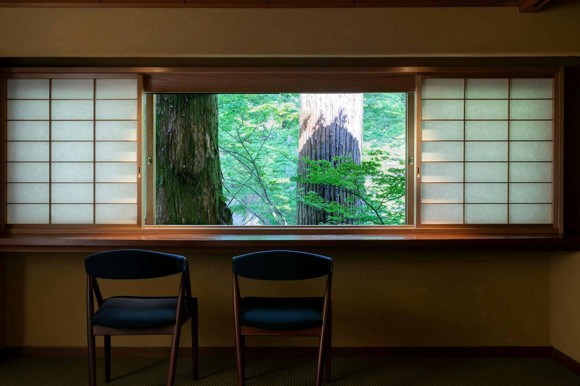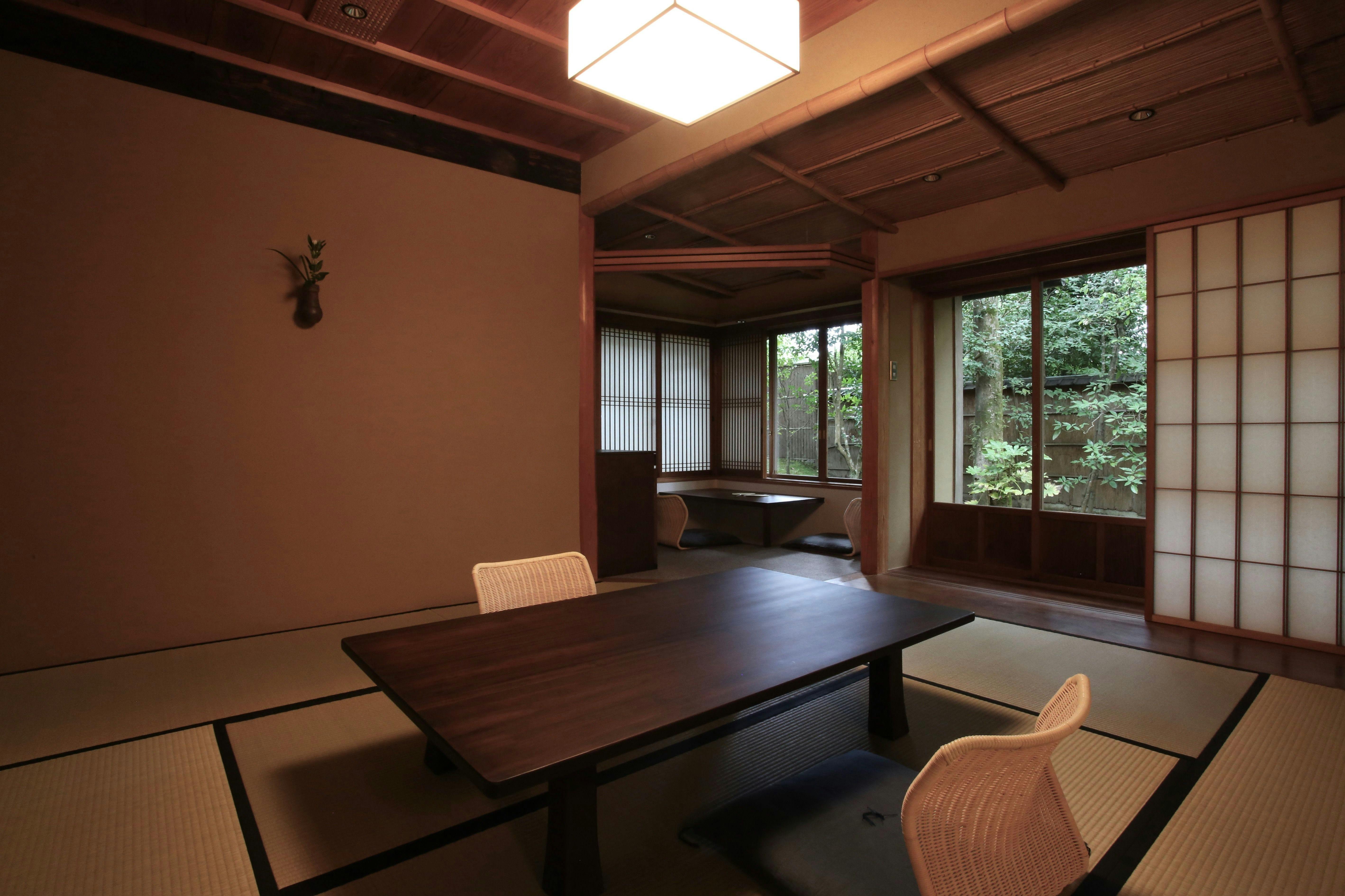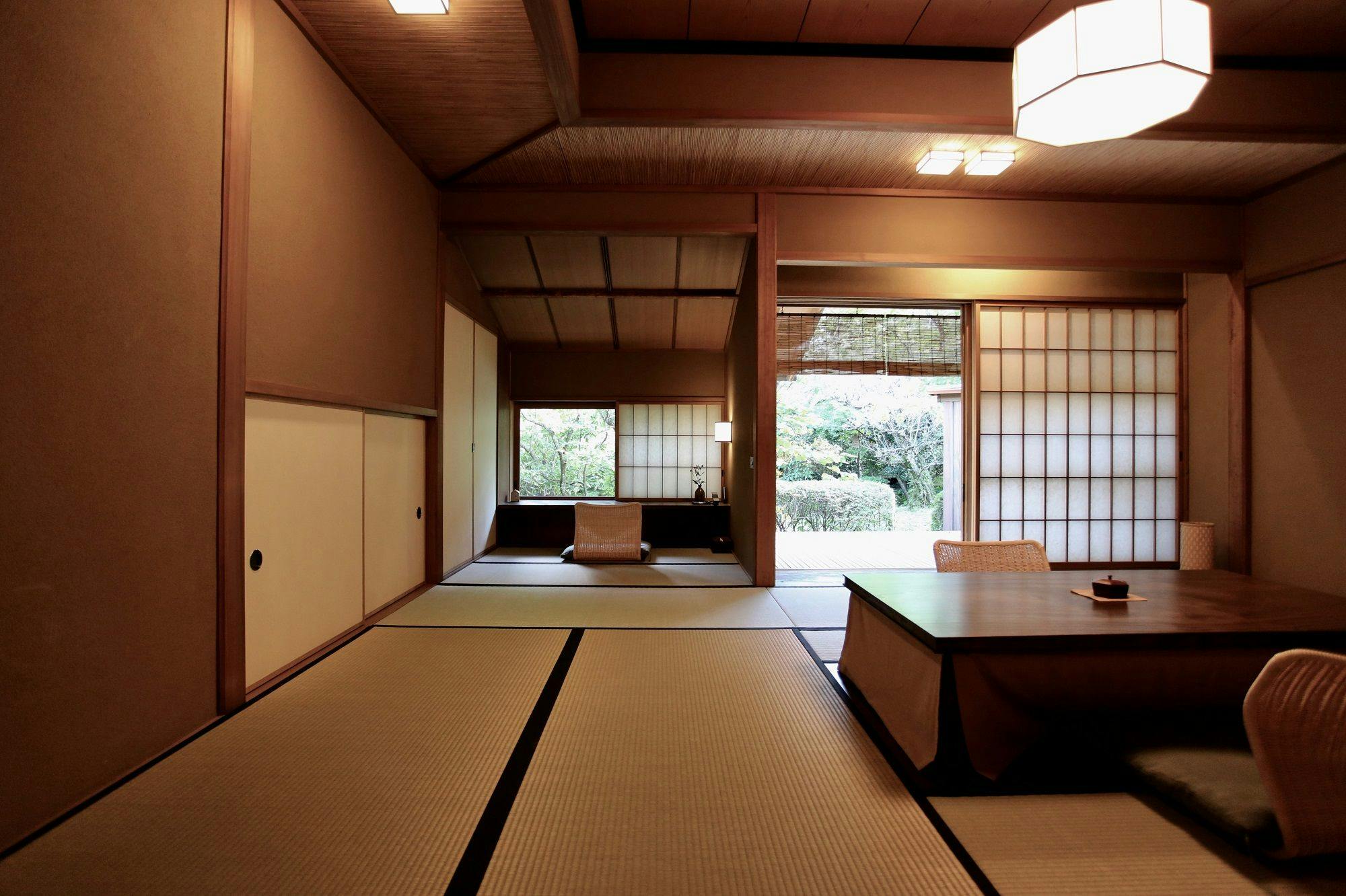 2015年12月リニューアル純和室の居間と寝室、内風呂からは庭の緑をお愉しみいただけます。掘り炬燵・床暖房を備えたお席で、ゆっくりとお部屋食をお愉しみください。