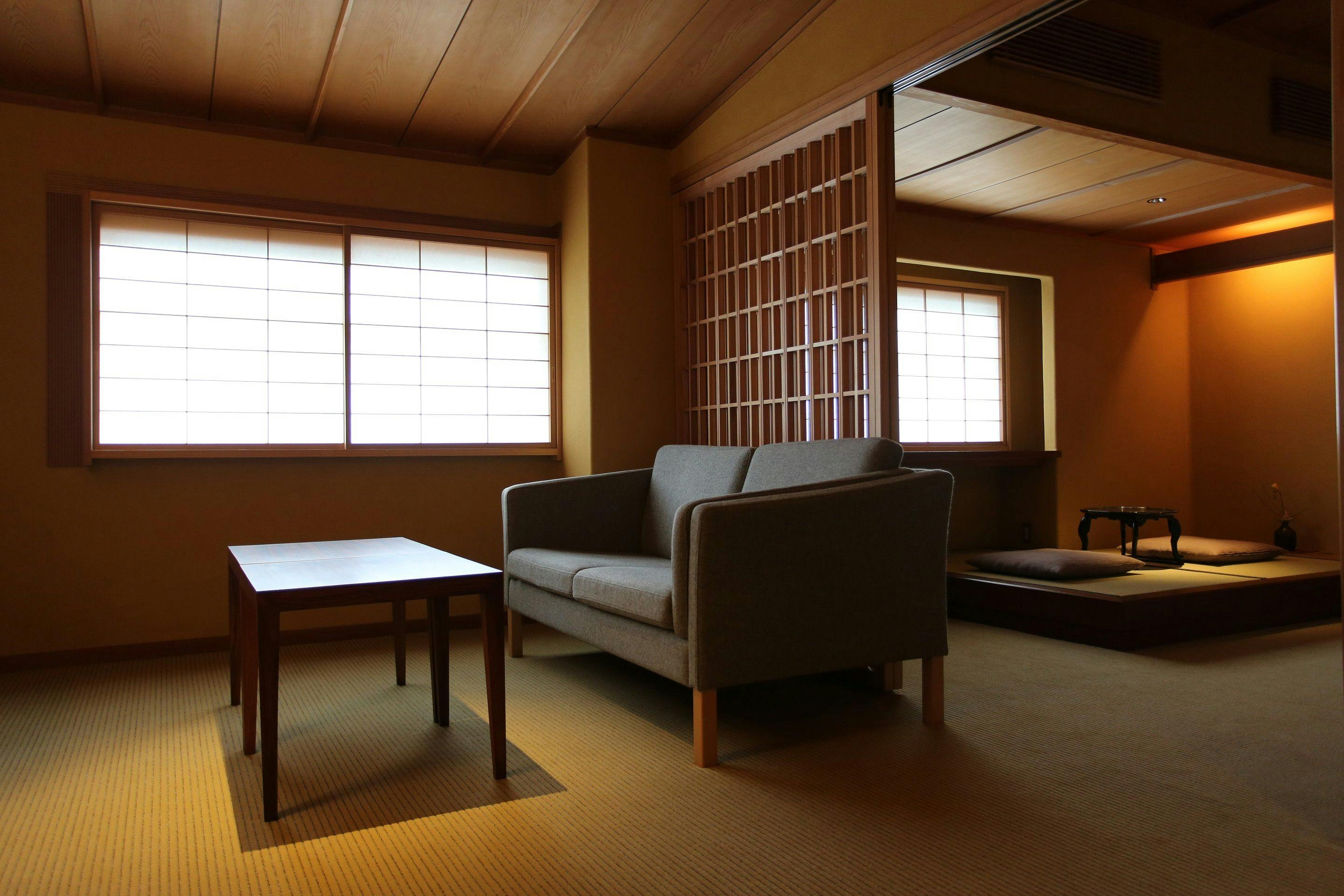 2017年9月リニューアルフロントロビー、大浴場にもほど近いメゾネットタイプの離れ和洋室。由布岳を望むベッドルームと掘りごたつの居間にてお寛ぎいただけます。庭に面した濡れ縁、露天風呂から季節の風情をお愉しみください。