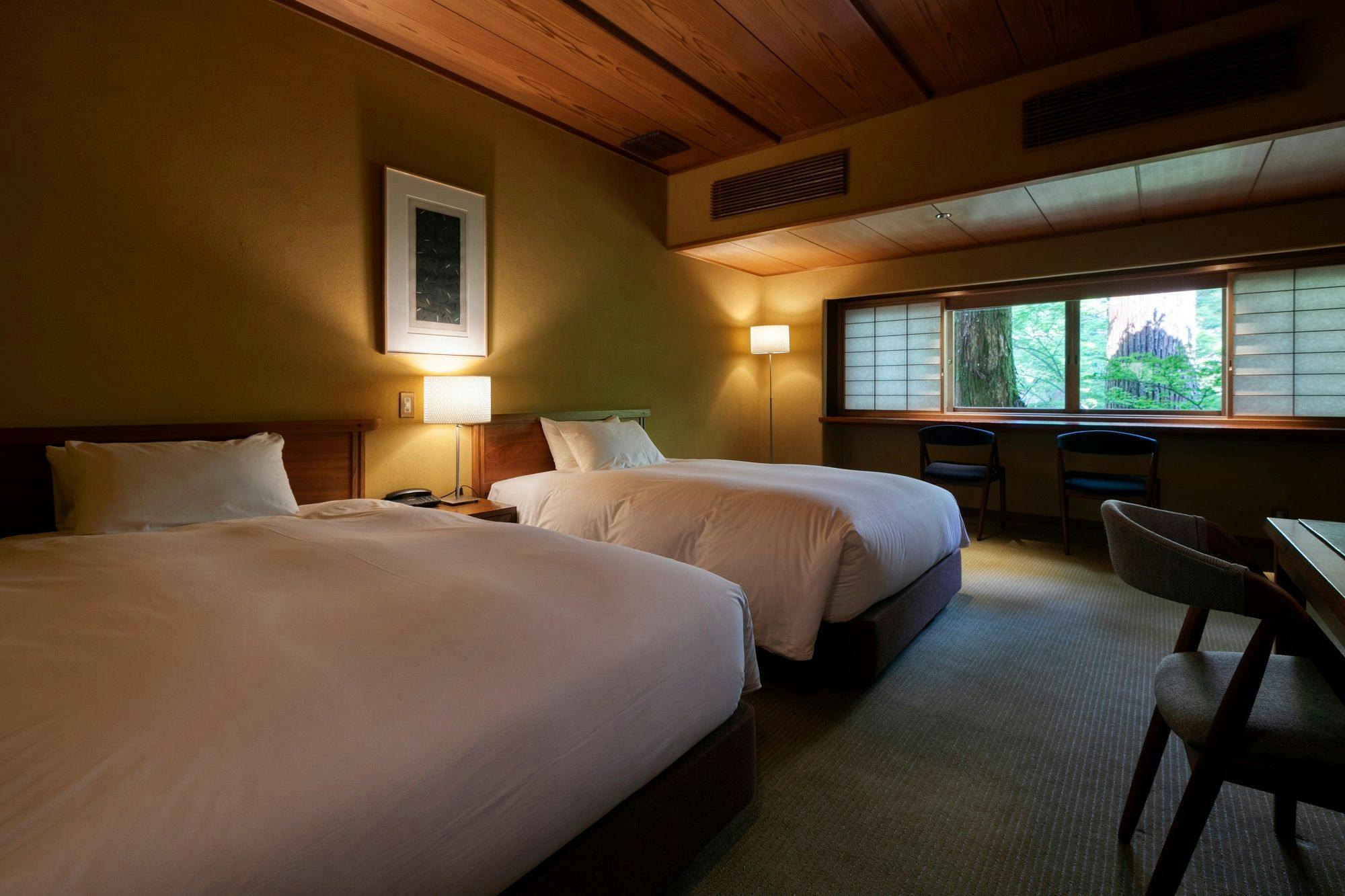2021年12月リニューアル本館2階、庭の眺望をお愉しみいただけるツインベッドルーム。お食事は館内のレストラン「蛍火園」にてご用意いたします。※洋室へのご宿泊は中学生以上の御客様に限らせていただいております。