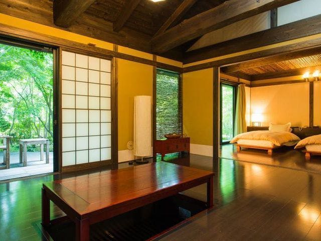 地下1000mから汲み上げる湯量豊富な自家源泉。由布岳を望む露天風呂、季節ごとに表情を変える庭園を楽しめる。大人の隠れ家「湯布院高原 ふうきの里」