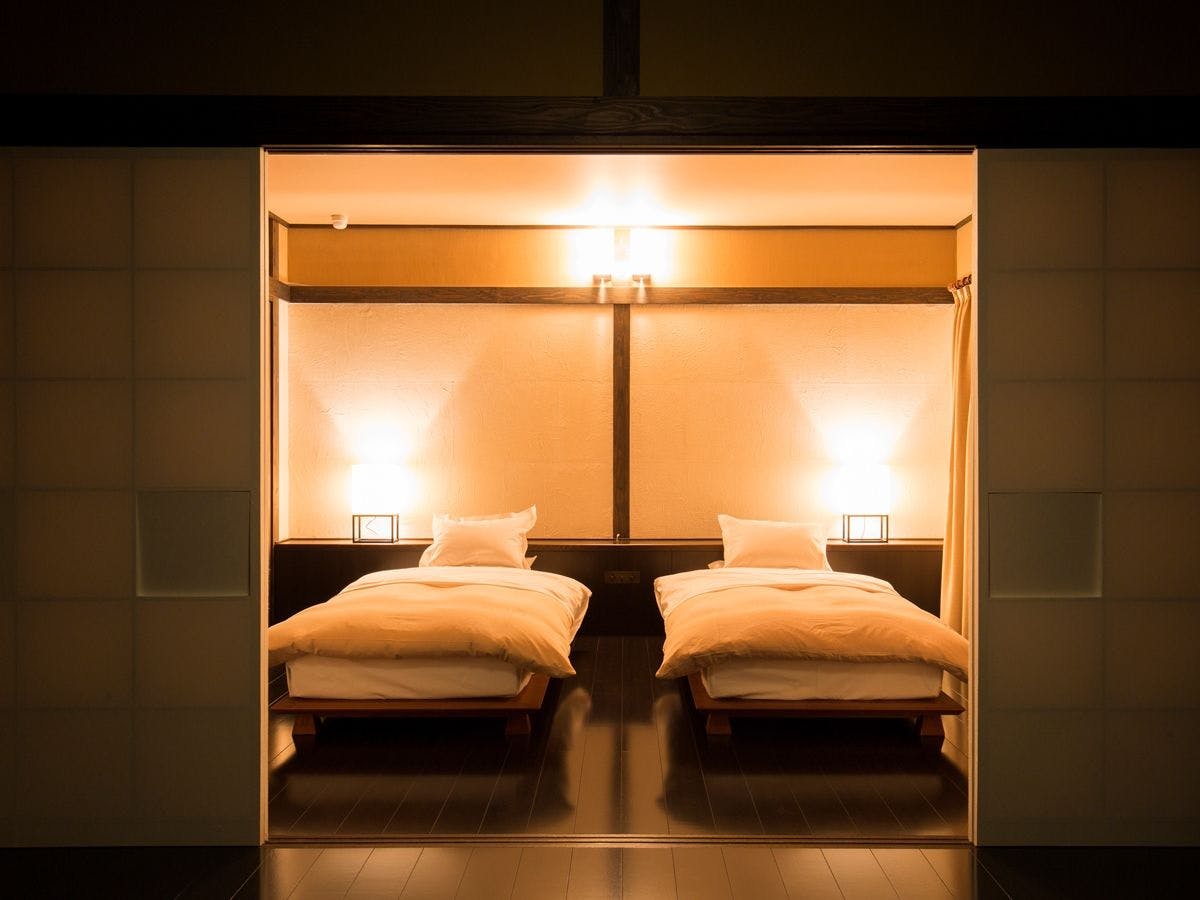 掘りごたつ、床下暖房、檜内風呂(温泉)、ツインベッド