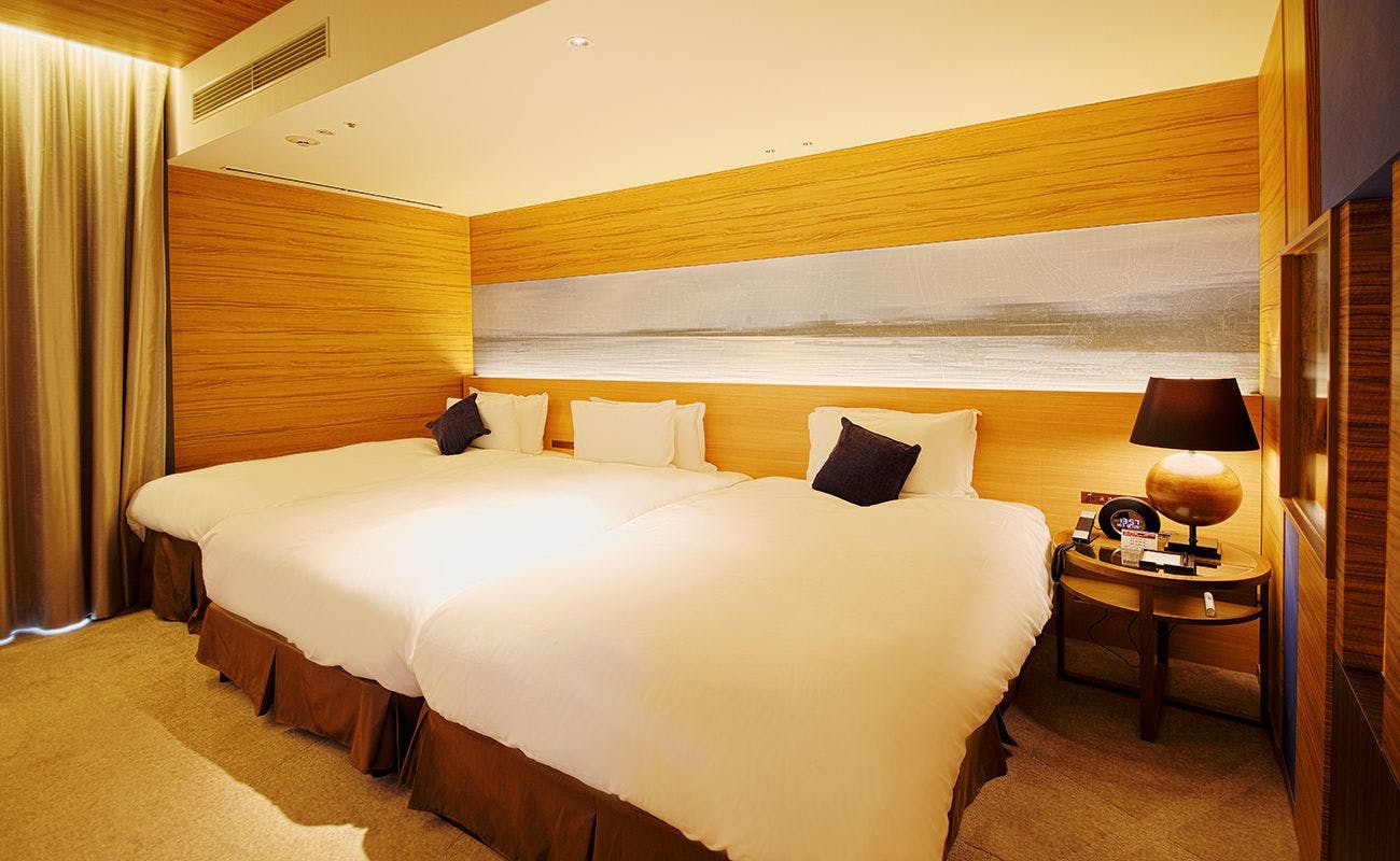 名古屋栄・繁華街方面と中川運河、名古屋港側の眺望がお楽しみいただけるツインルームとなります。