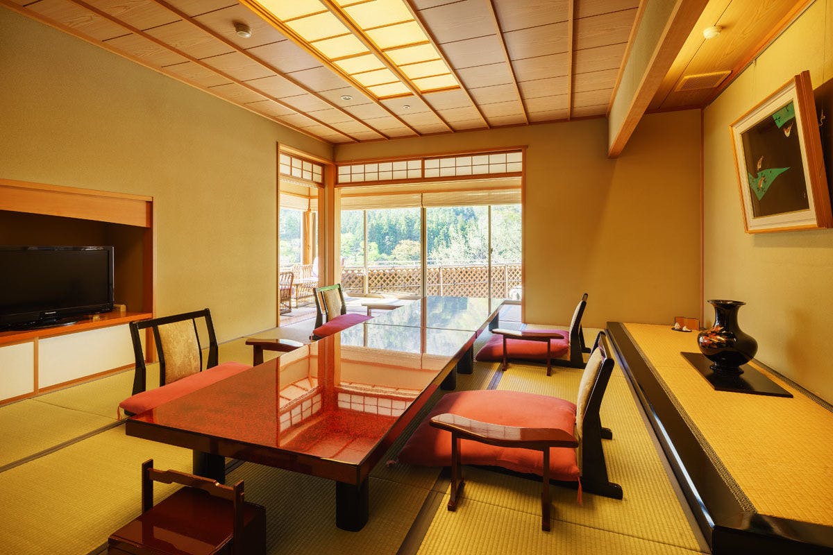 純和風3間続きの離れ山翠の客室です。お部屋80平米以上の広々とした贅沢な空間で、静寂と安らぎのひとときをお過ごしいただけます。