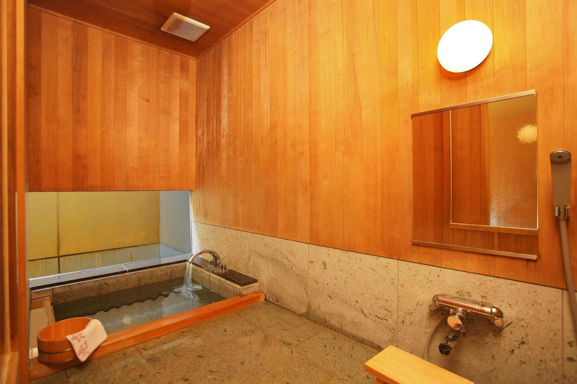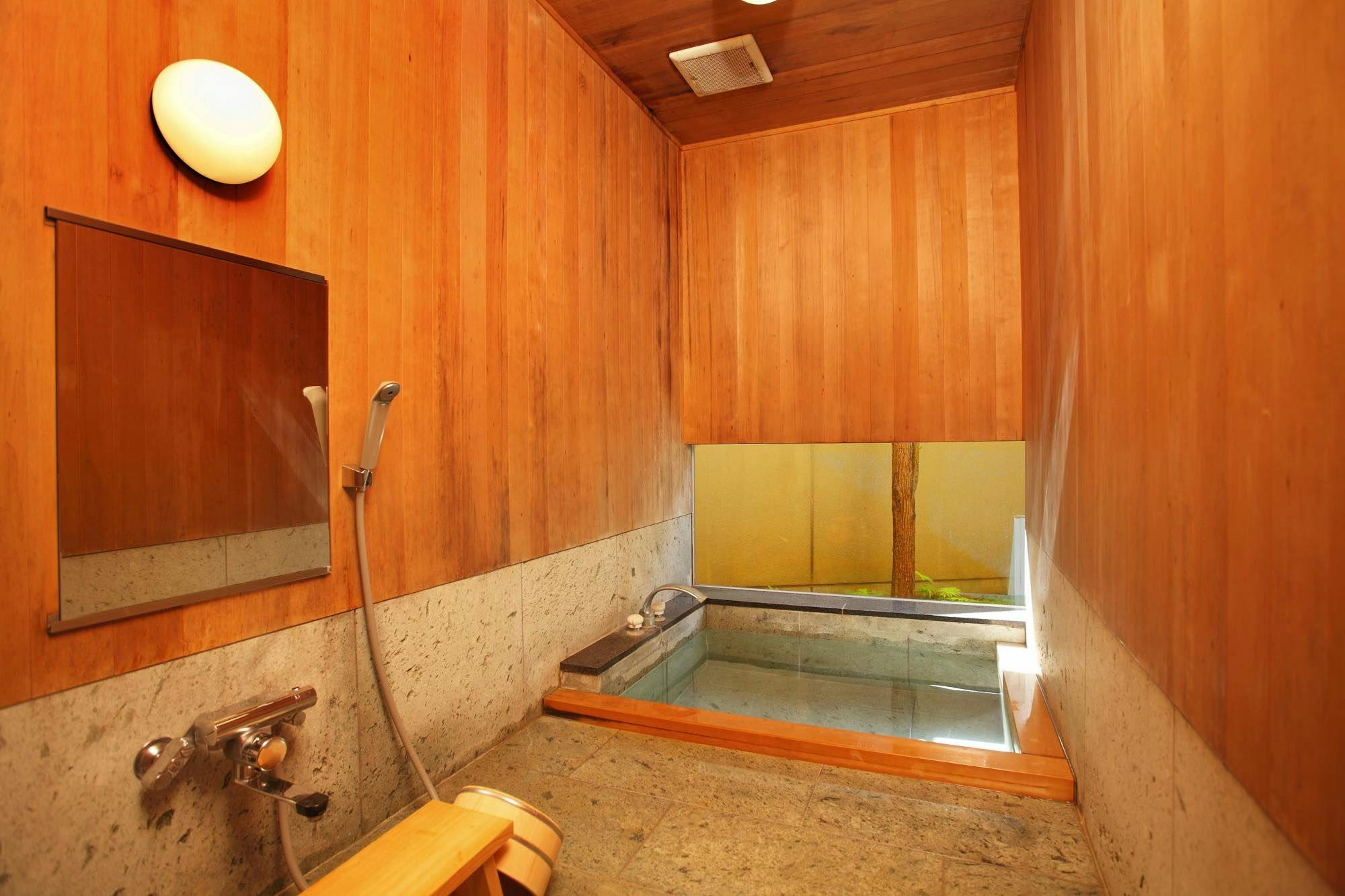 お部屋には檜と石が調和する浴槽、檜の壁に囲まれた源泉100%掛け流しの内風呂がございます。
