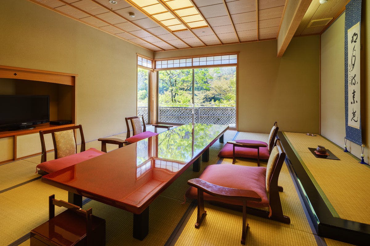 渓流のせせらぎが静かに迎えるやすらぎの離れ。窓から眺める四季折々の美しい景色。広々とした寛ぎの和室。風情ある源泉かけ流しの内風呂。6室だけの限られた空間だからこその極上のひとときをご用意いたしました。