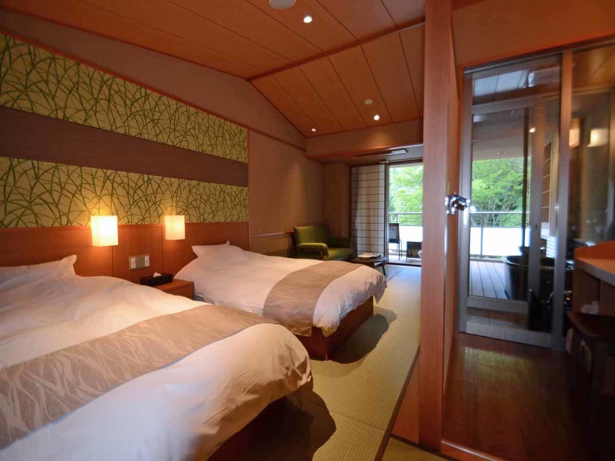 2台のベッドとリビングスペースの和室と、有馬温泉内ではわずか数件の眺望を楽しめるお部屋の「金泉」かけ流し露天風呂。お部屋の金泉露天とテラスからは有馬三山のひとつ湯槽谷山の絶景をお楽しみください。