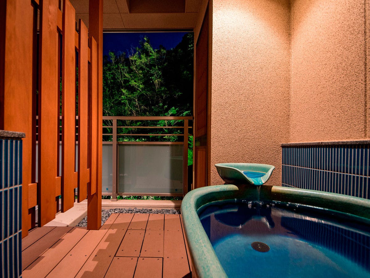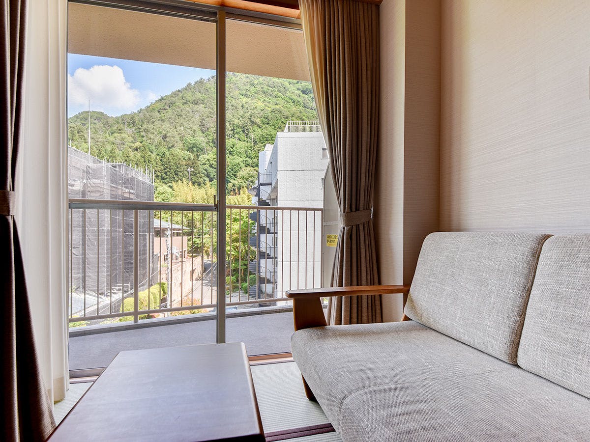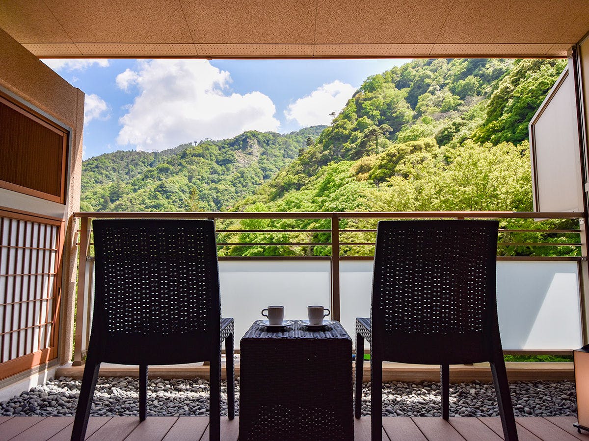 温泉街の中心から離れた静かな立地を生かして、有馬三山の湯槽谷山と六甲有馬ロープウェーを遠くに眺められる、露天風呂とテラス付のお部屋です。