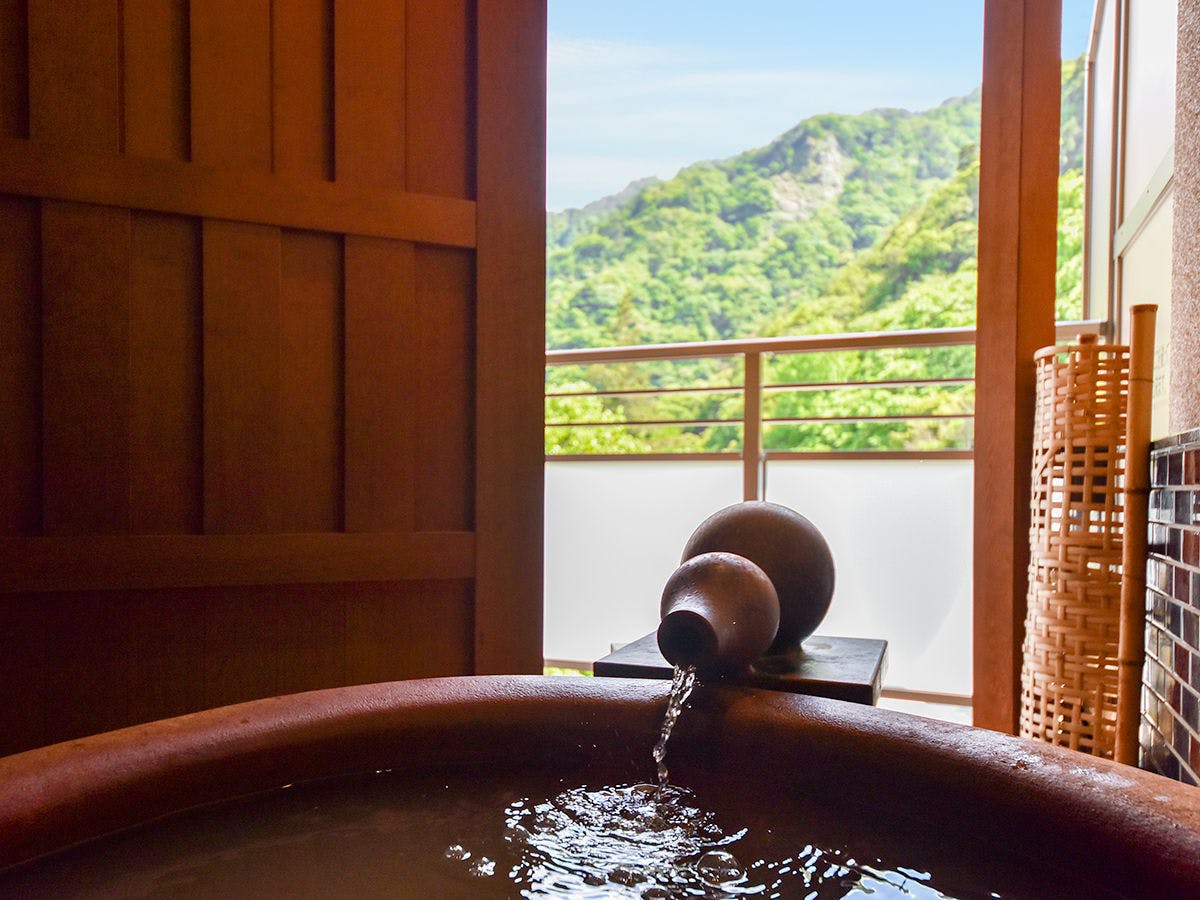 温泉街の中心から離れた静かな立地を生かして、有馬三山の湯槽谷山と六甲有馬ロープウェーを眺められる、金泉露天風呂とテラス付のお部屋です。