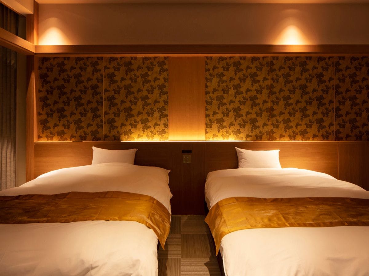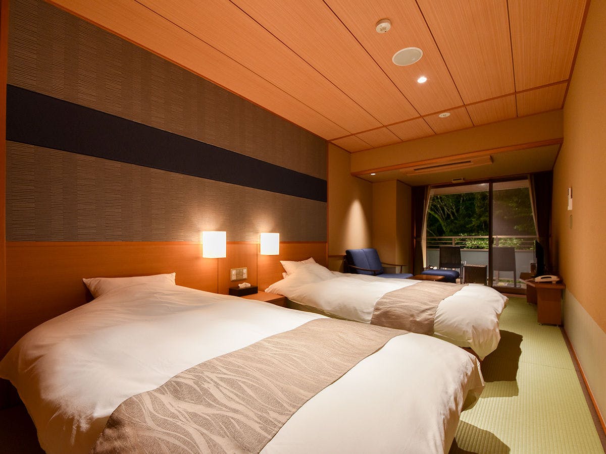 和室のお部屋にセミダブルサイズのベッドを2台ご用意いたしております。