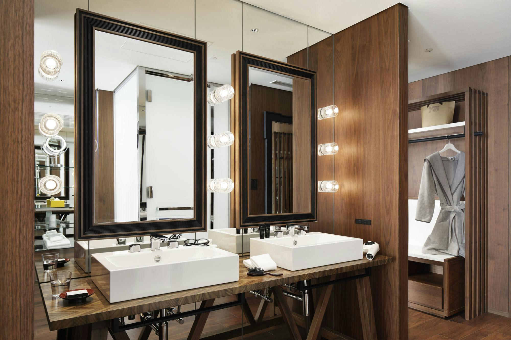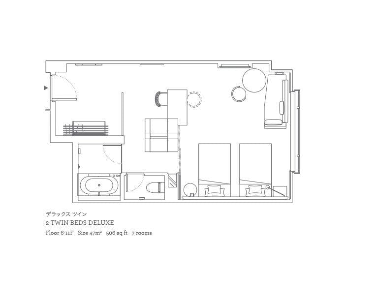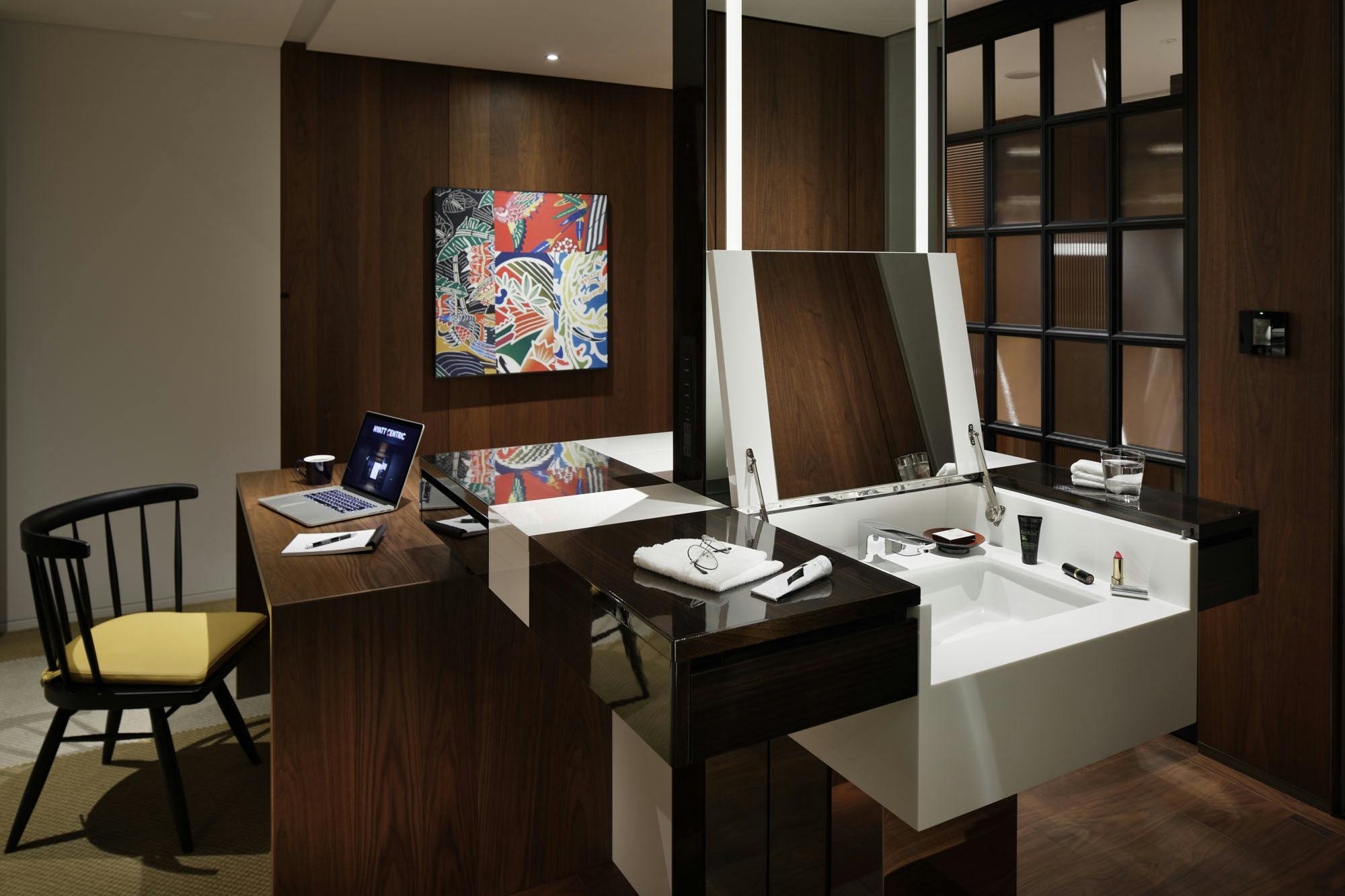 並木通りに面した47平米の開放的な空間の客室は、ゆったりとしたバスタブ、ベッド2台や窓側のデイベッドのほか、メイクアップ・ワーキング・ダイニングと目的に合わせて変形するマルチファンクションテーブルなど、ユニークなデザインと快適性を兼ね備えています。