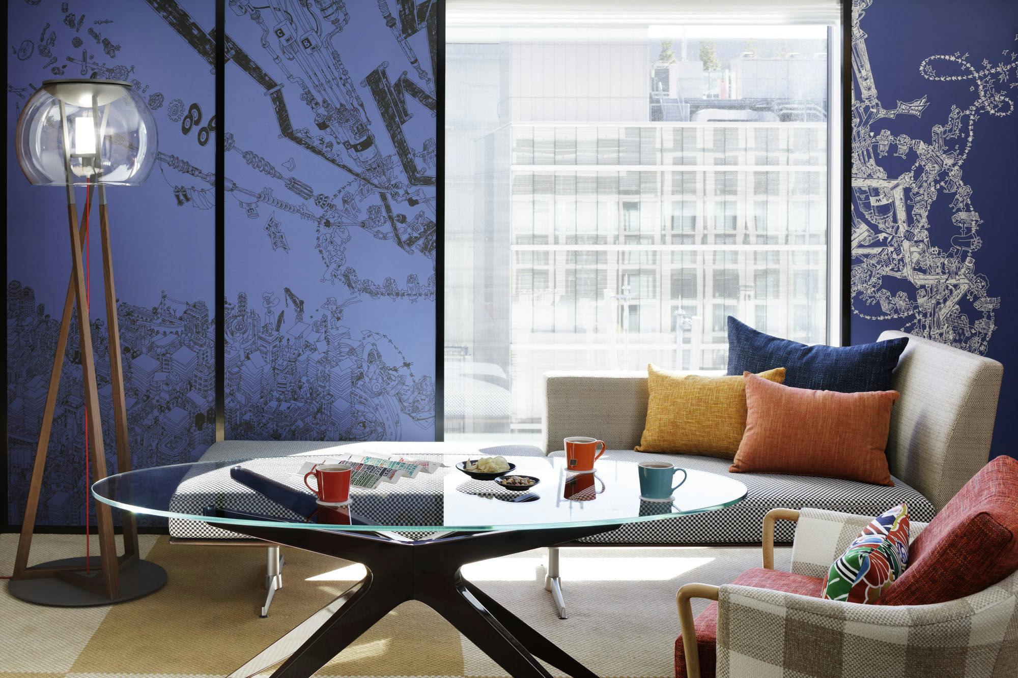 キングサイズベッドやゆったりとしたバスルームのほか、メイクアップ・ワーキング・ダイニングと目的に合わせて変形するマルチファンクションテーブルなど、ユニークなデザインと快適性を兼ね備えた35平米の開放的な空間です。