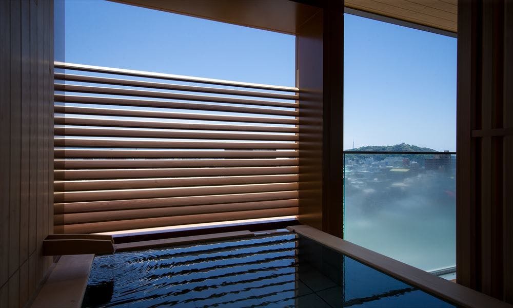 30室すべての客室に道後温泉の引き湯を利用した客室露天風呂と、最上階には展望浴場と露天風呂をご用意しました。日本最古の道後温泉の御湯の恵みにこころ丸ごとひたる宿。