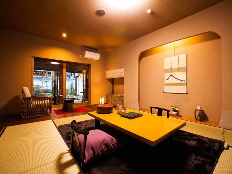 母屋で唯一ベッドが備わる露天風呂付き客室。お部屋も2間あり、ごゆっくりとお寛ぎ頂ける母屋特別室になります。