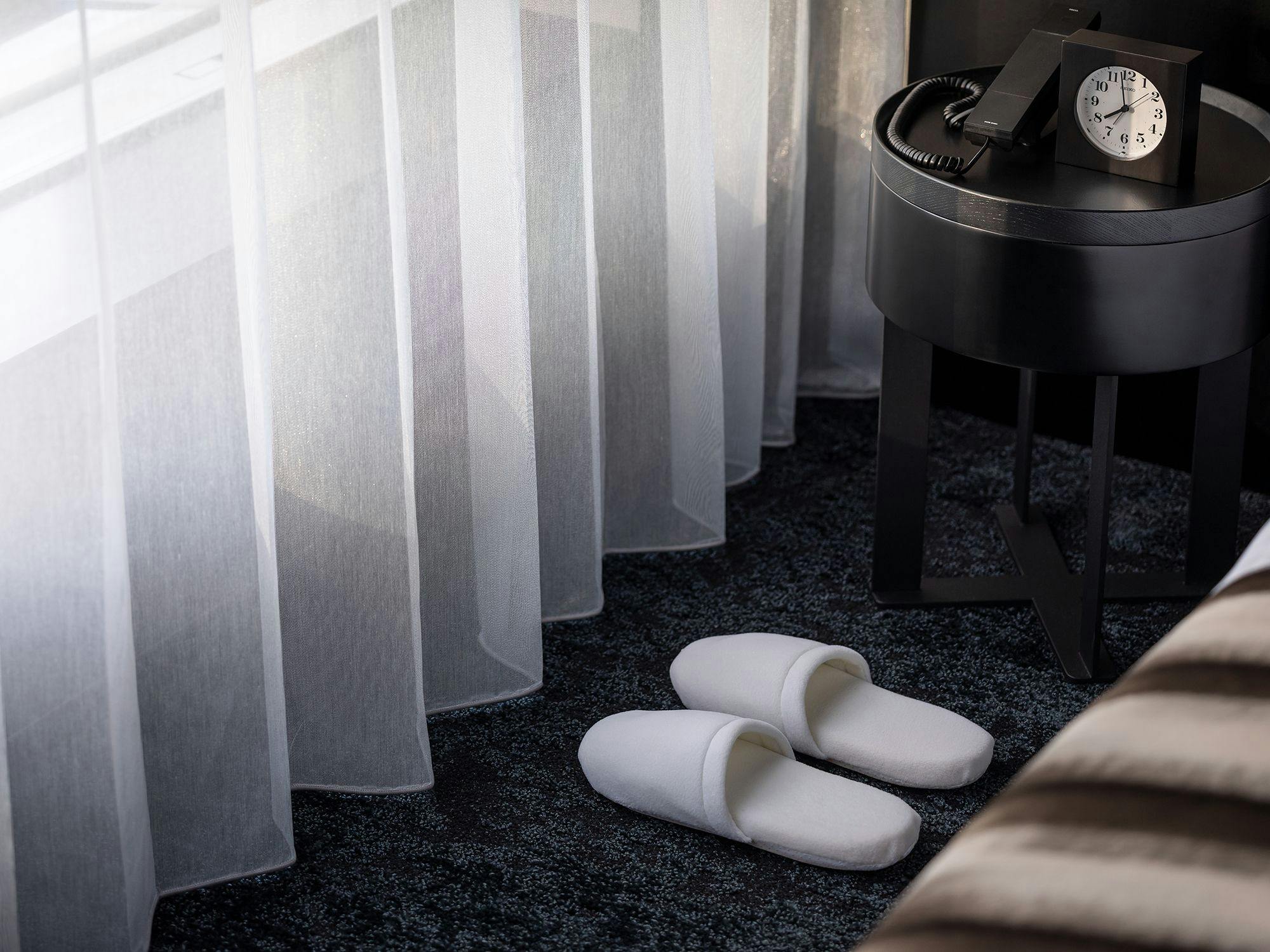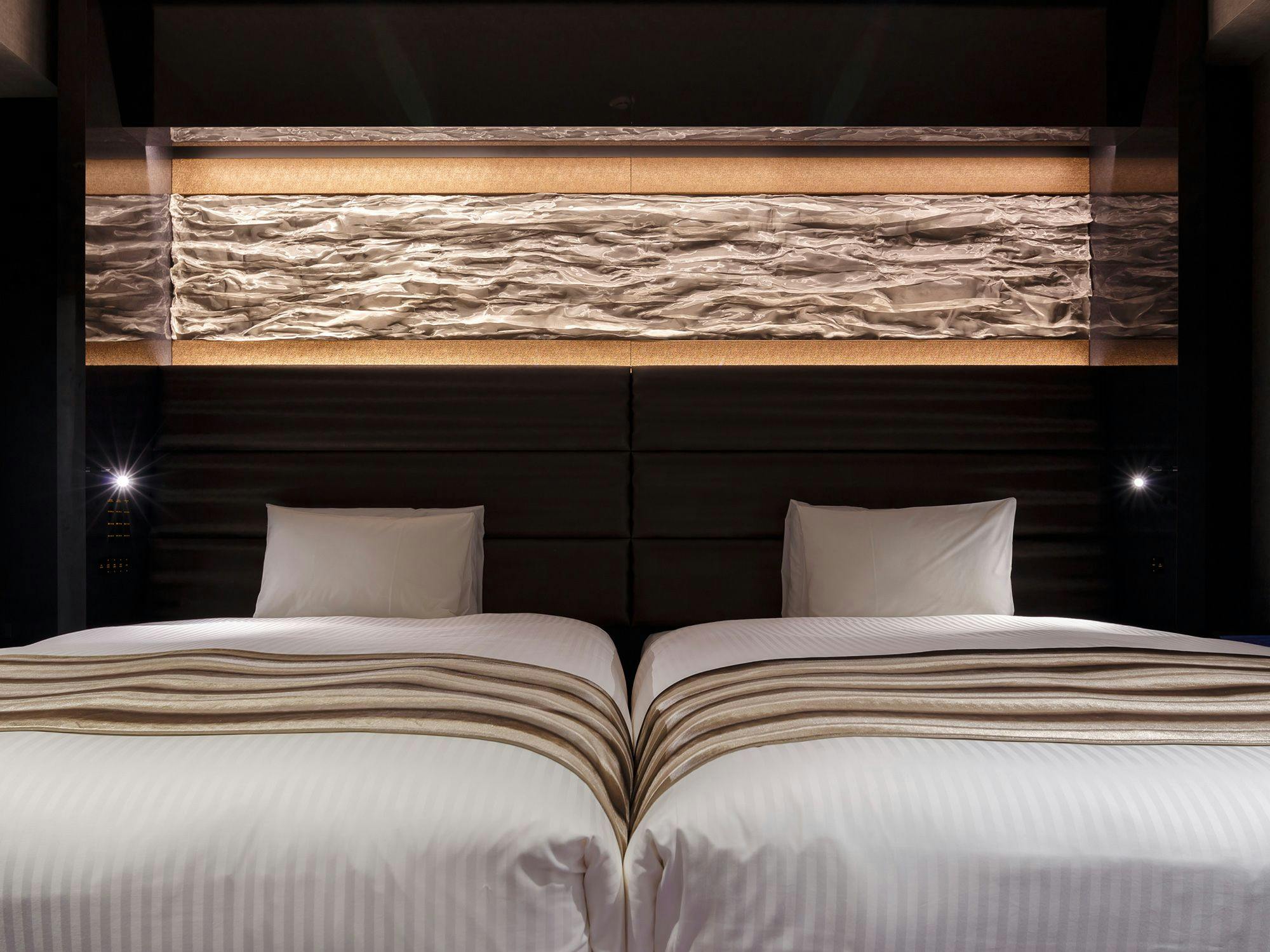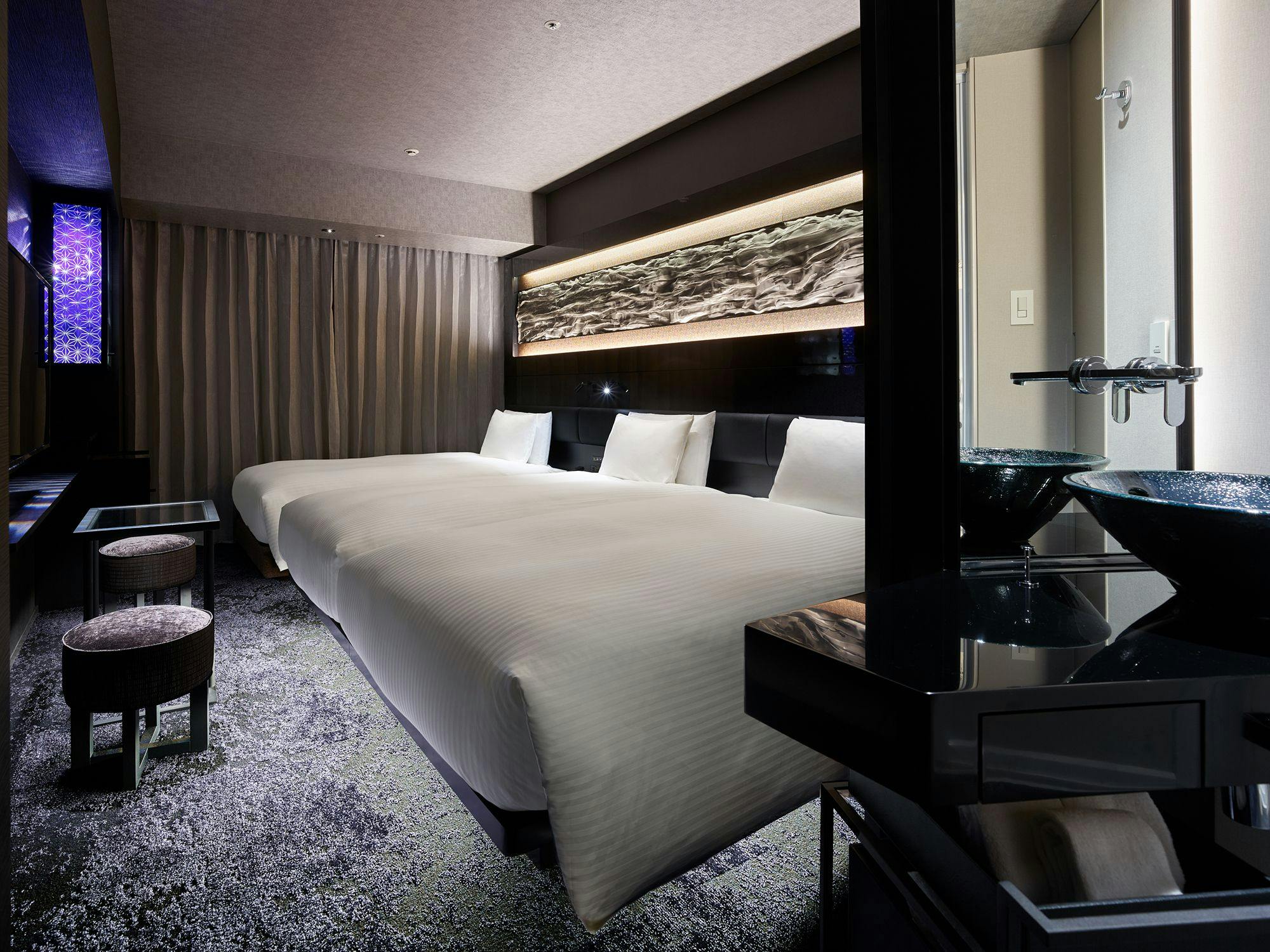 非日常性を演出する上層階(地上13階~15階)ならではの開放感が魅力。対面ソファサイドの窓から眼下に中央通りを見渡せる、ハリウッドツインの客室です。
