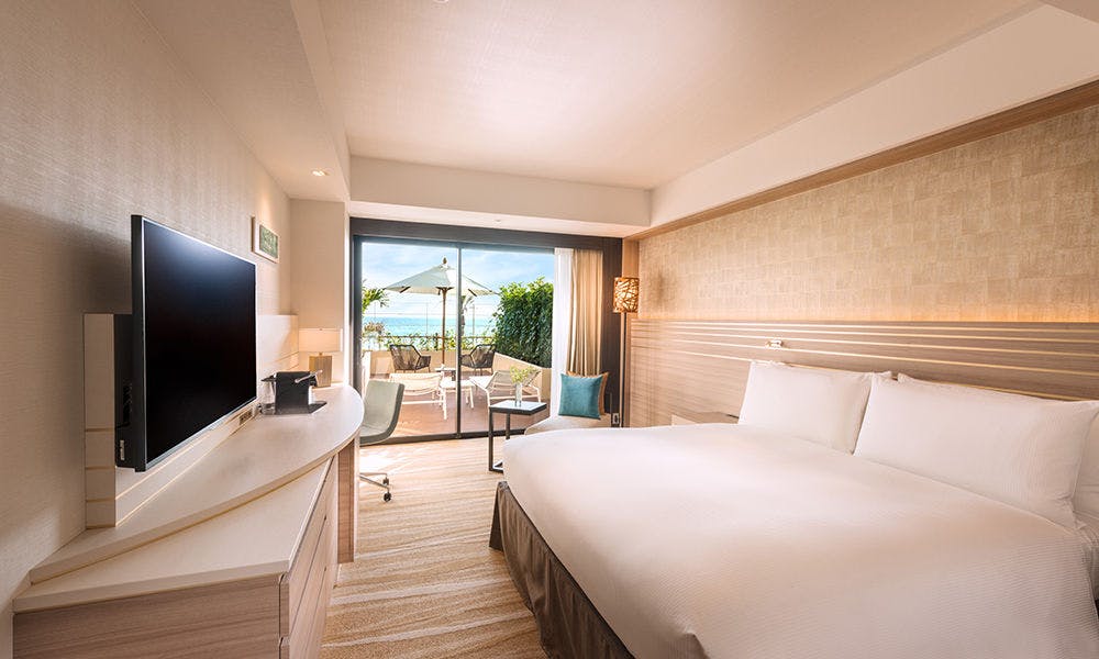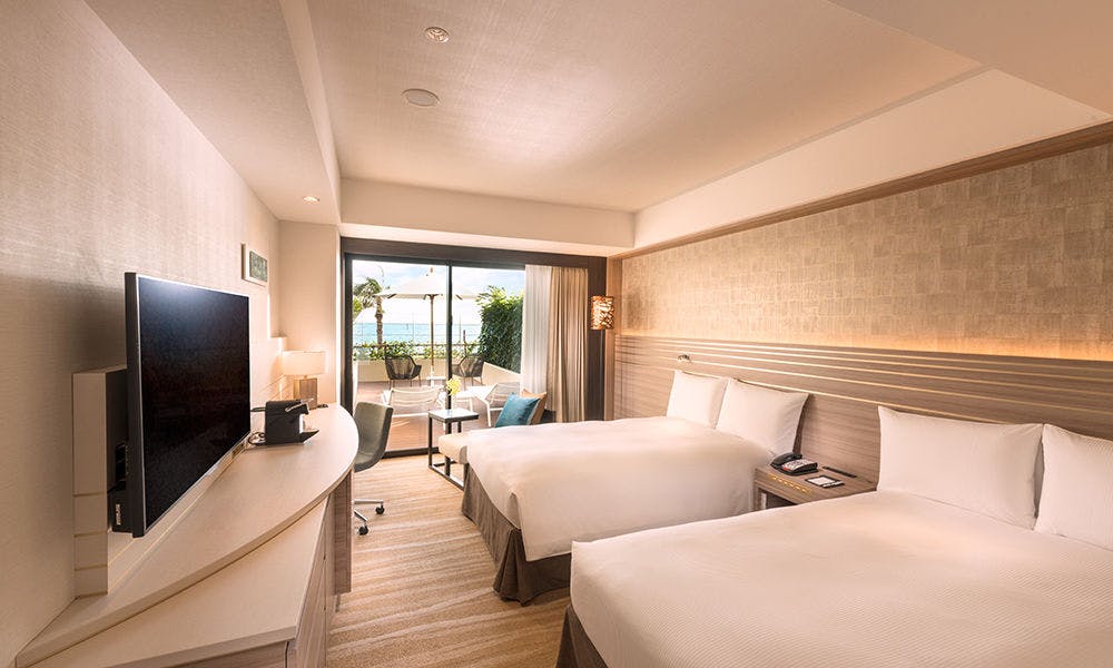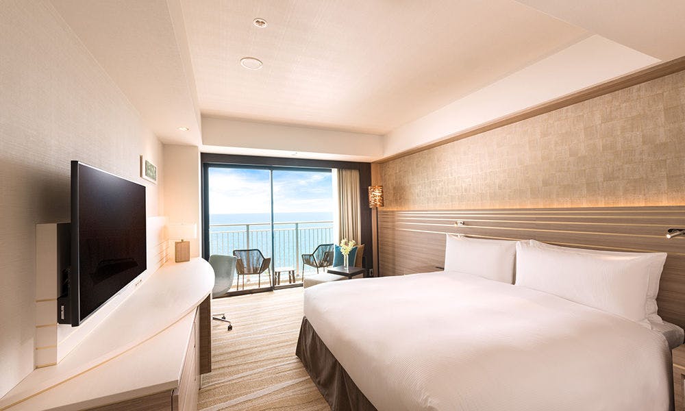 【洗い場付きバスルーム/ベッド180cm】青く澄み渡る鮮やかな海を眺められる最上階のプライベートバルコニー付客室※3~4名利用時は追加ベッド■朝食付き■スイートルームにご宿泊の方は、朝食をご利用いただけます。