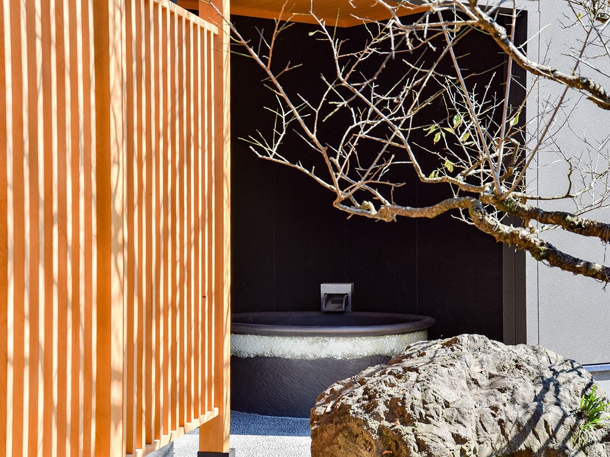 露天風呂から四季折々の日本庭園を眺められ、内風呂は木曽檜の香りが心地よさを演出します。