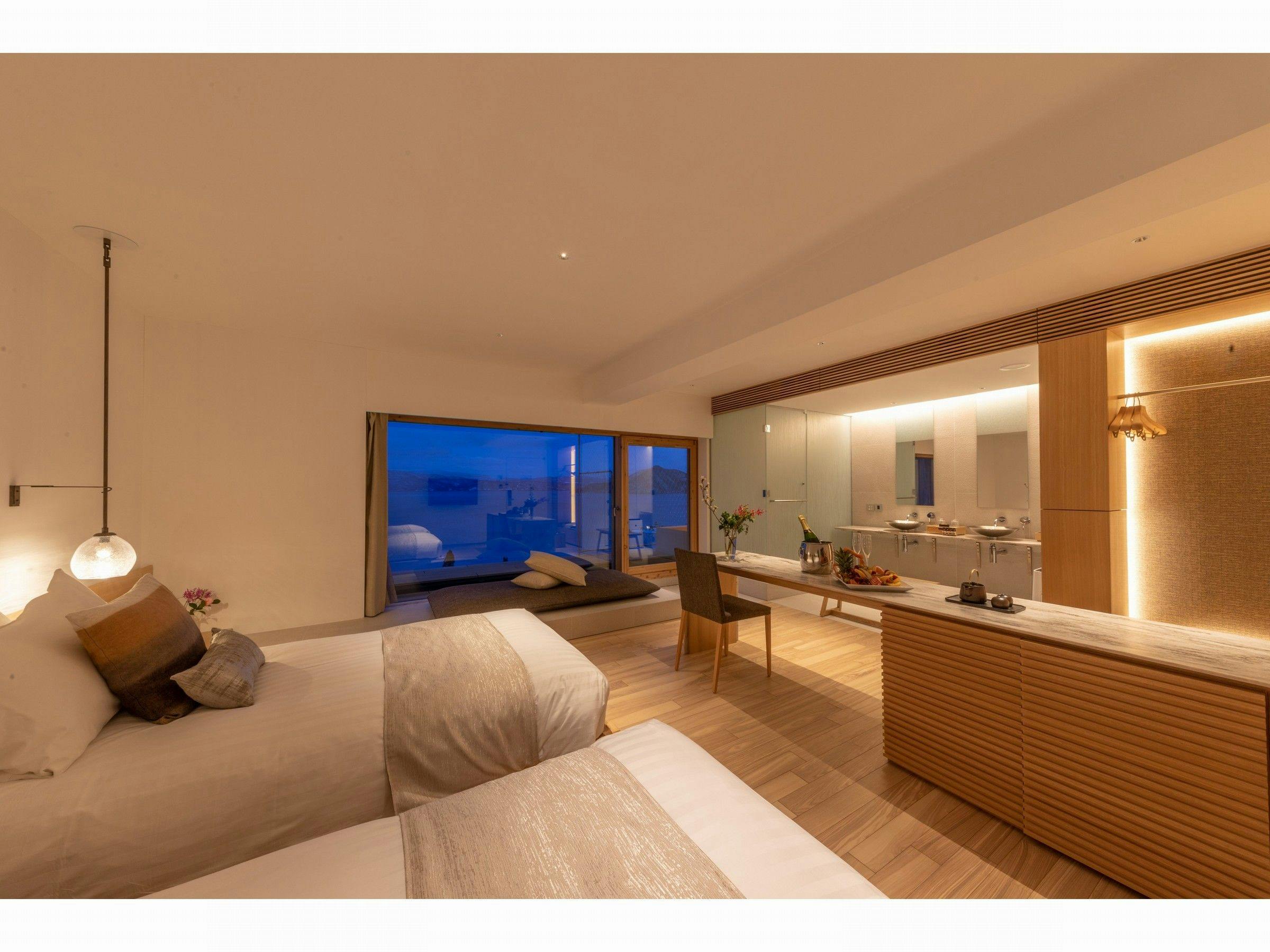幅110cm x 長さ203cmの広めシングルベッドが2台。3名様でご利用の場合はエキストラベッドをご用意いたします。室内シャワーブースのほか、バルコニーに露天風呂をご用意。ダブルベーシンが、慌しいご出発の朝も快適にお過ごしいただけるようお手伝いします。【ご注意ねがいます】露天風呂は沸かし湯です。温泉ではございませんのでご了承ねがいます。