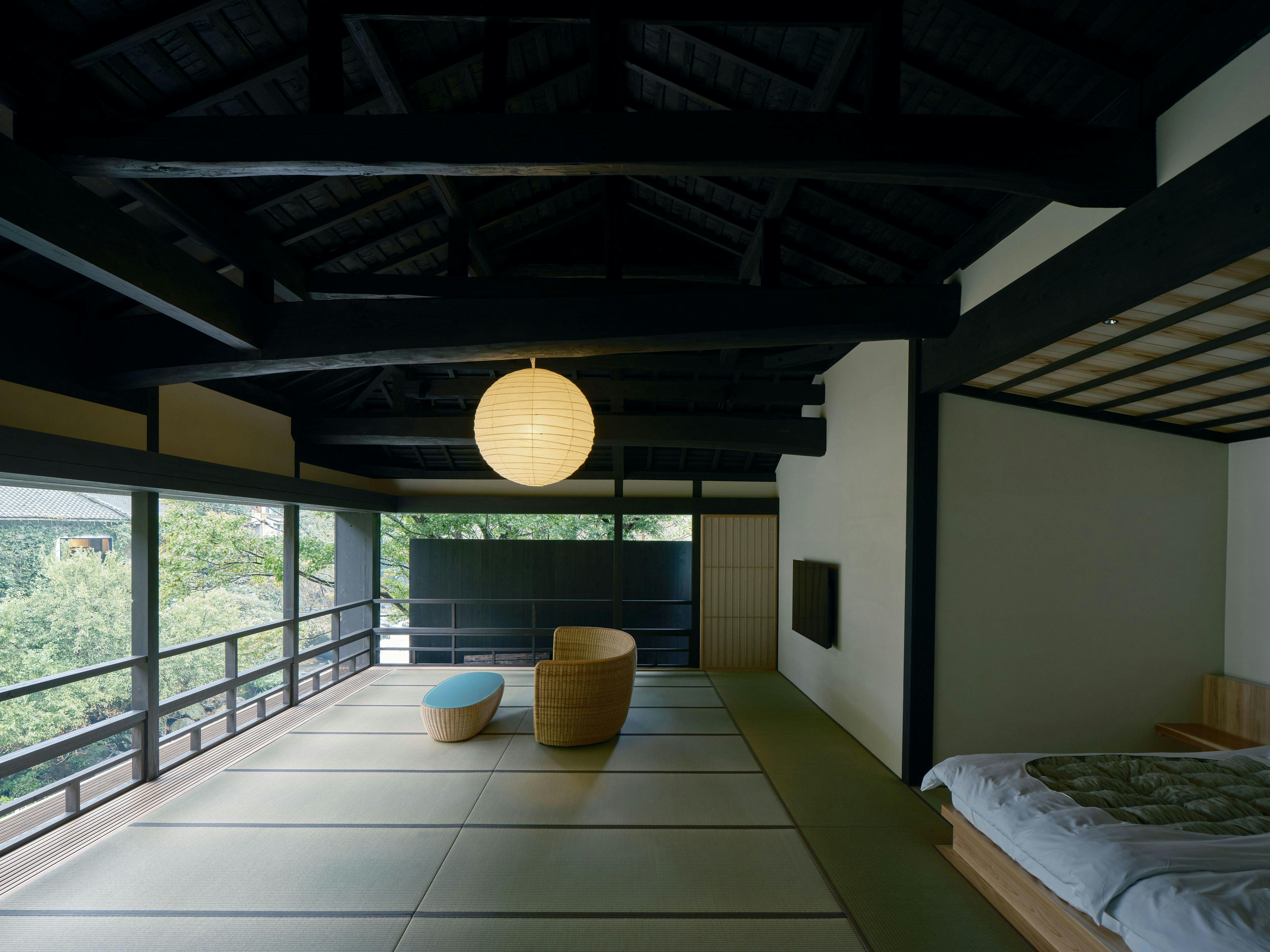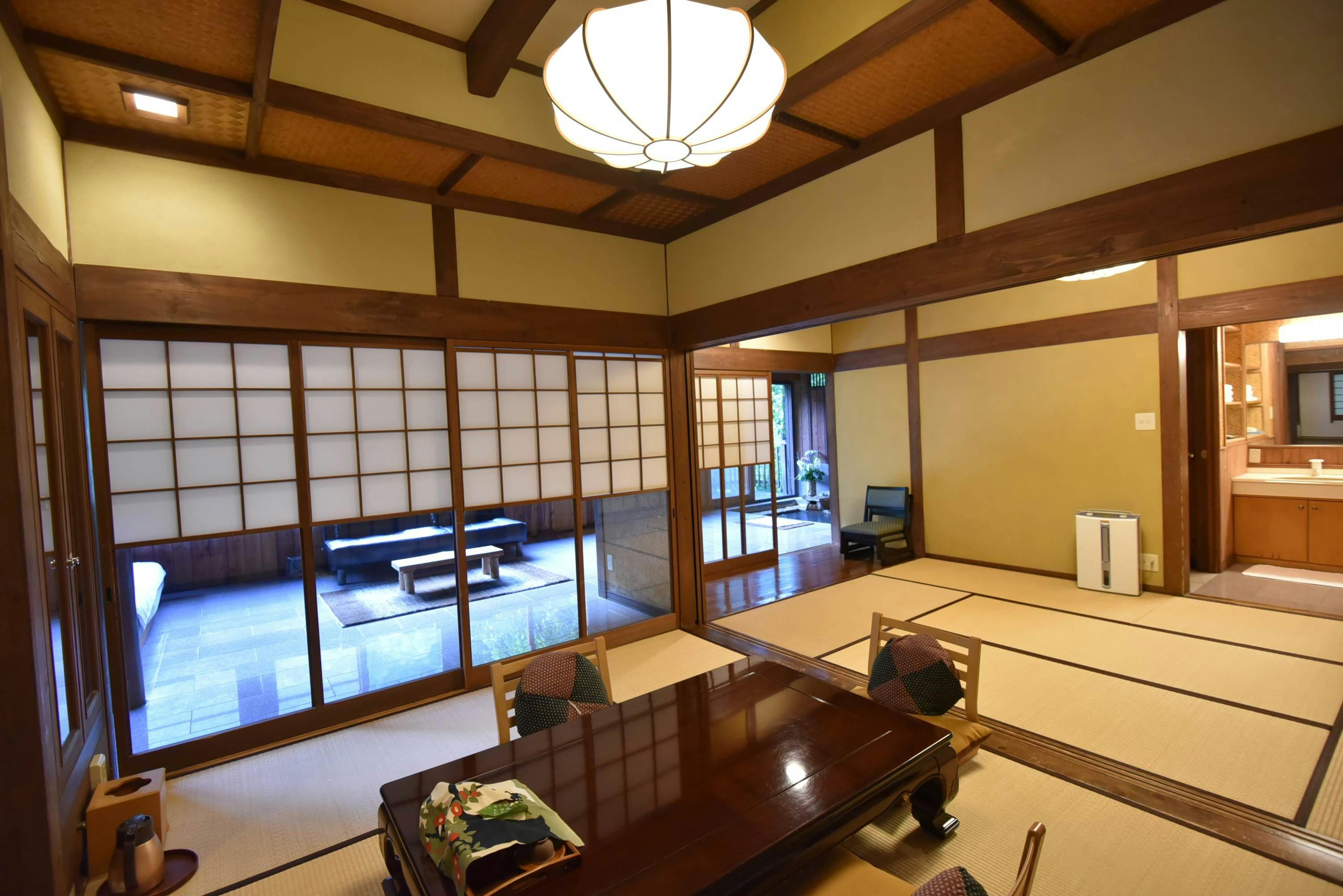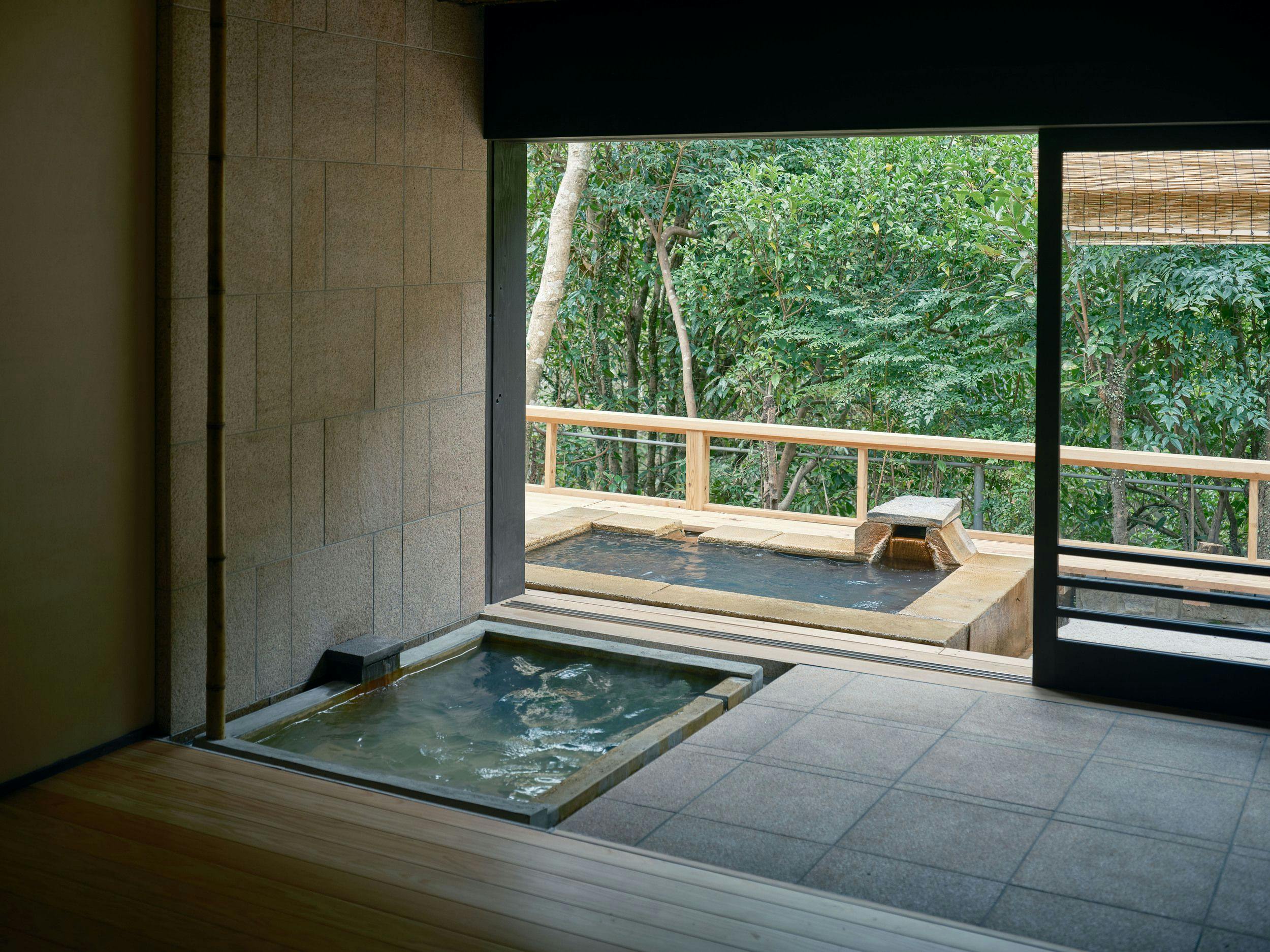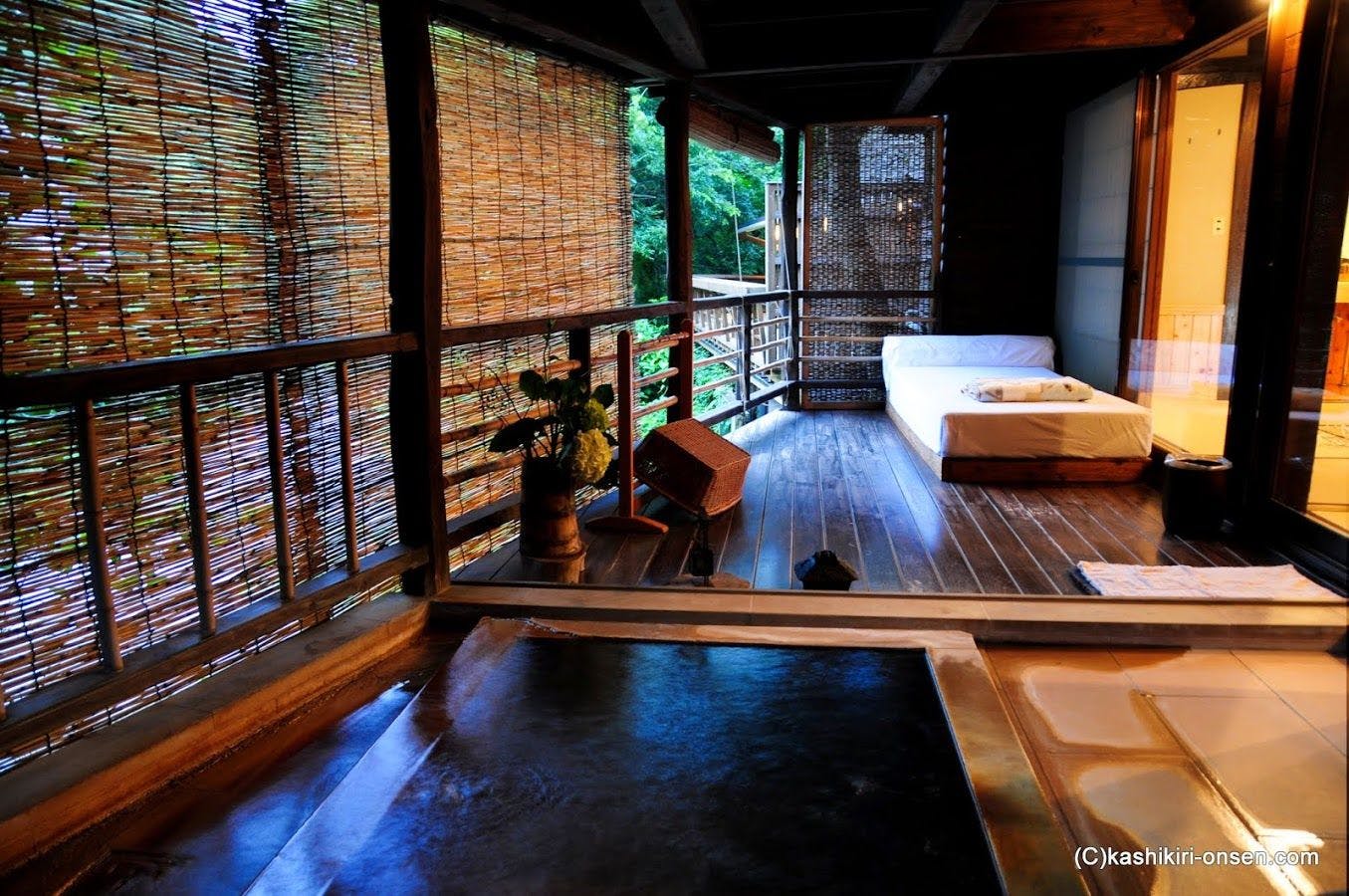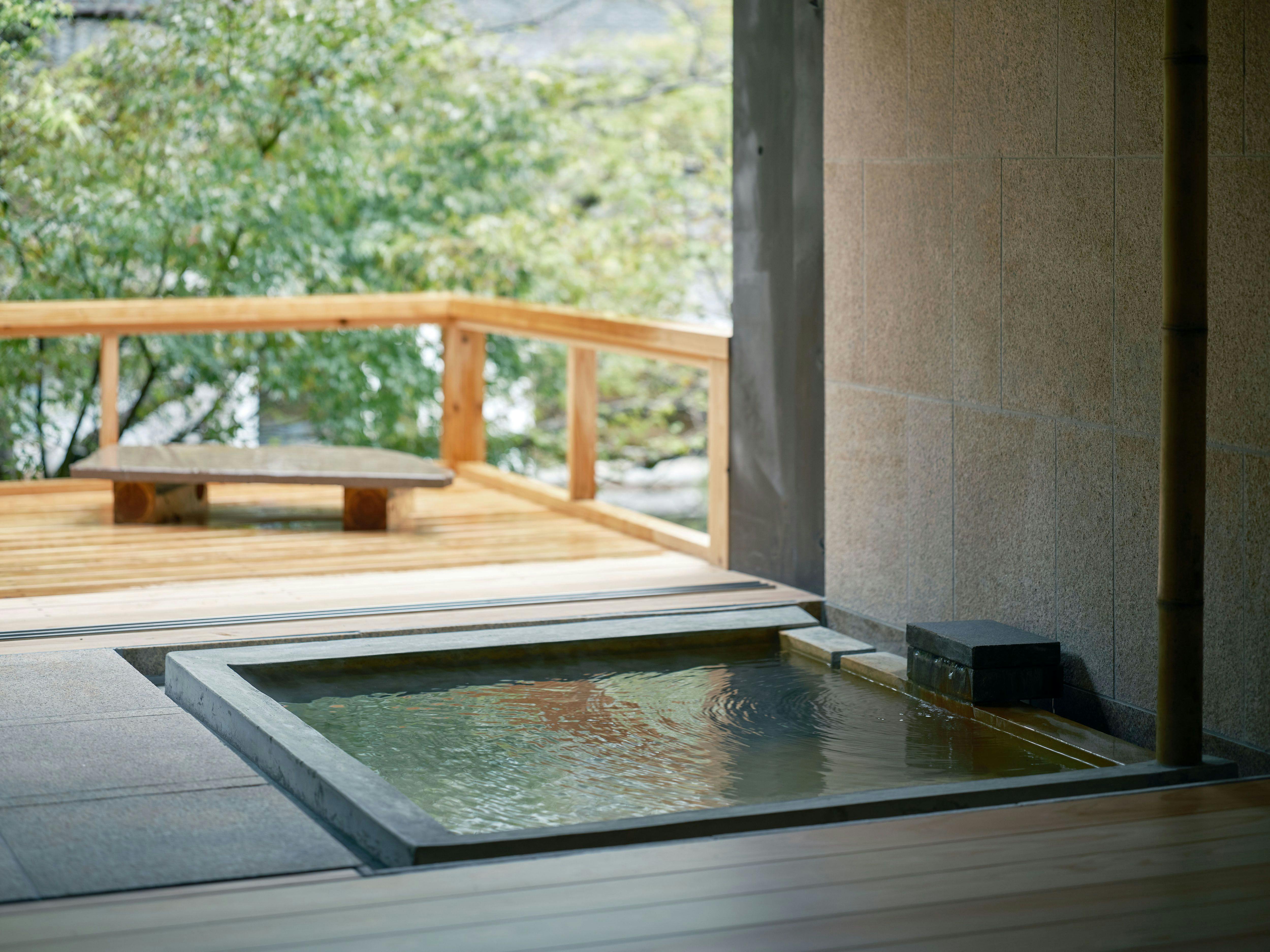 日本ではじめて誕生した、露天風呂付き客室!!天降川に面した広めのウッドテラスに、露天風呂とデイベッドを備えた開放感のある、二間つづきのお部屋です。川のせせらぎを間近に感じながらお寛ぎください。