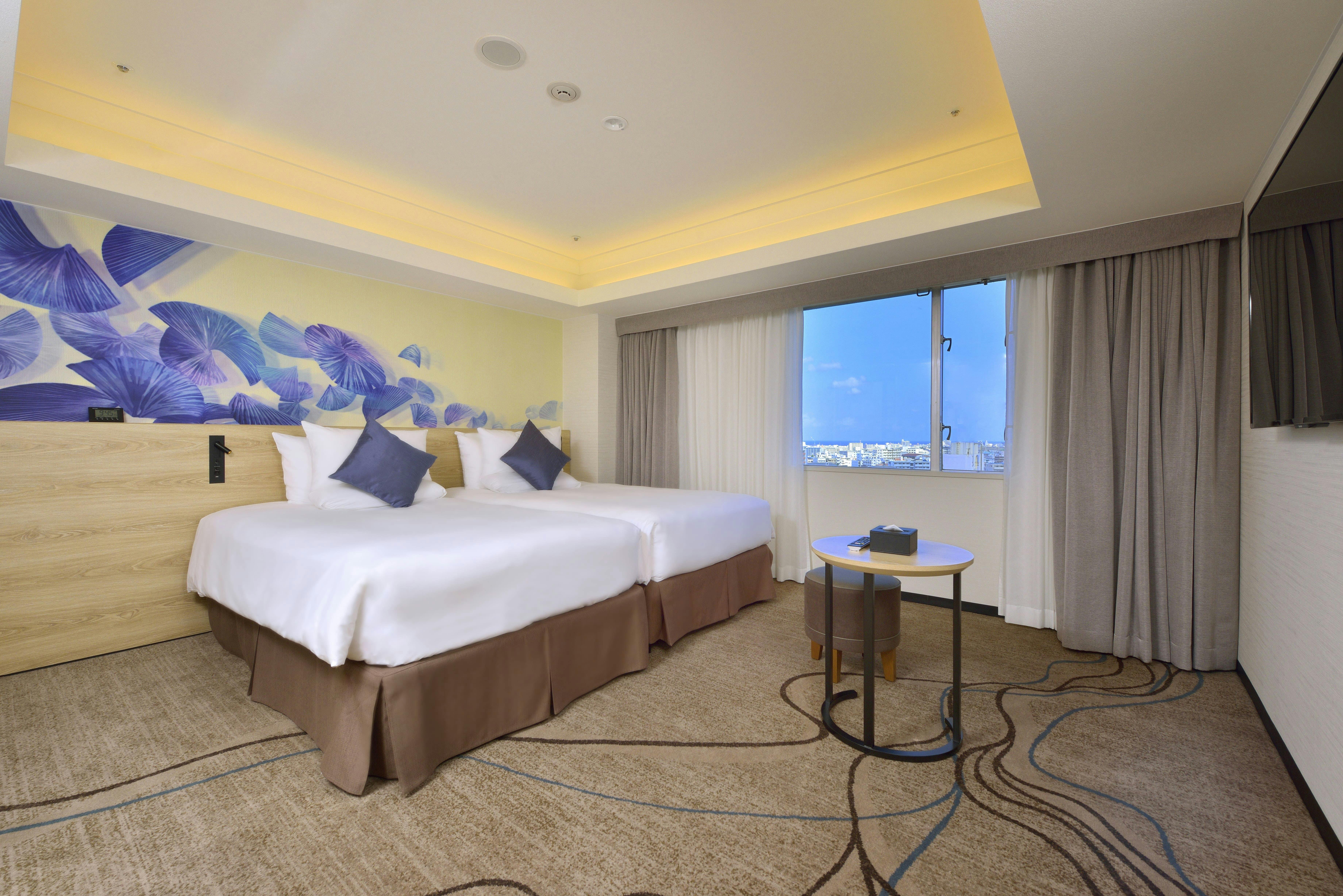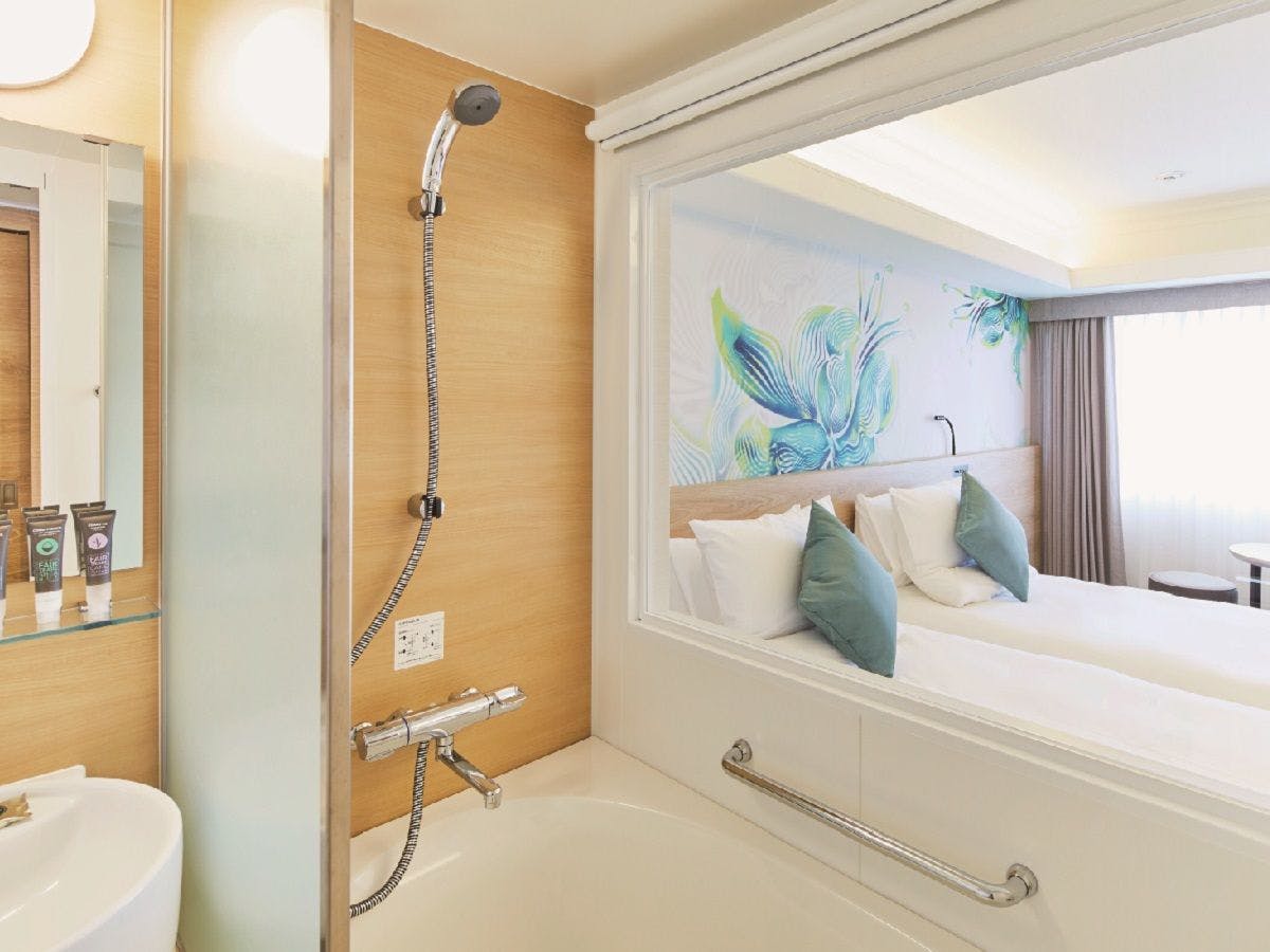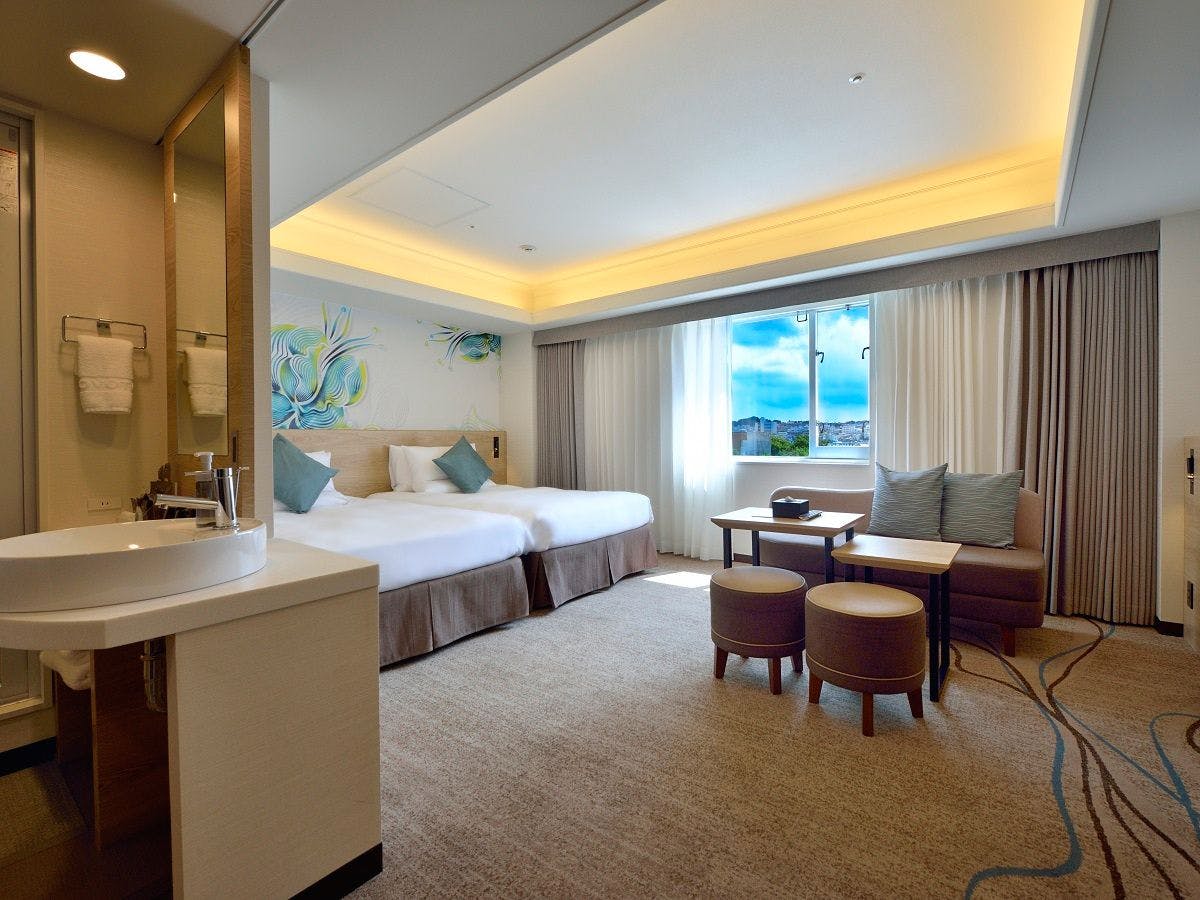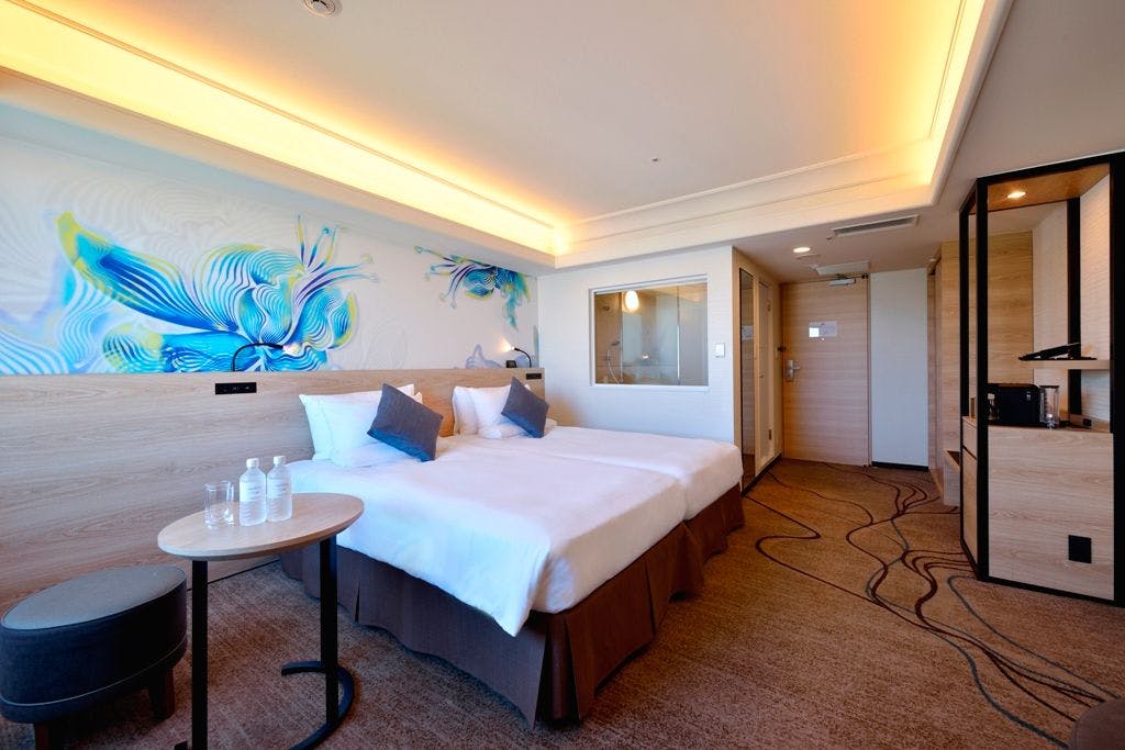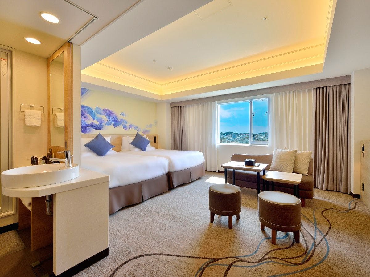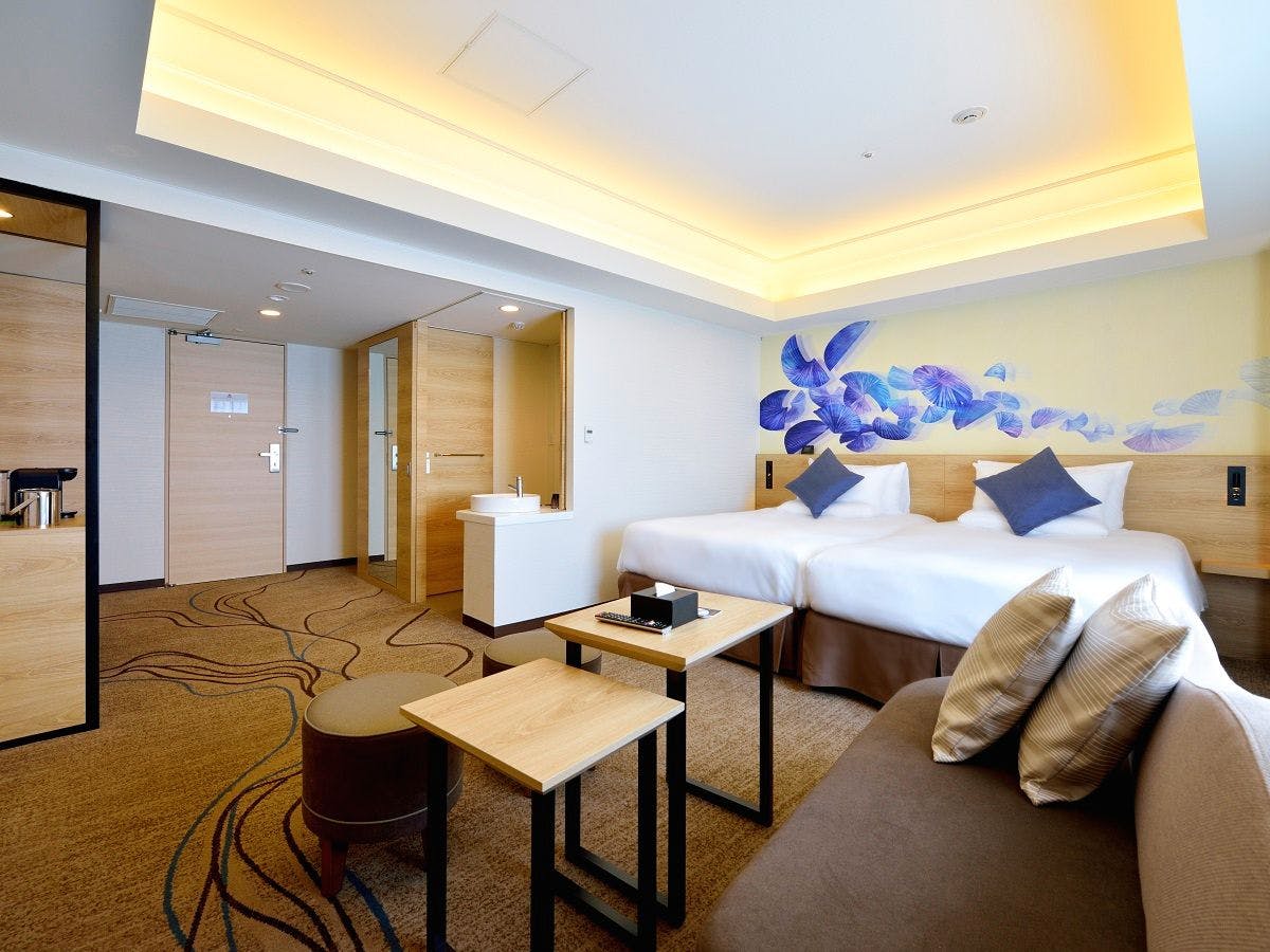 【最上階プレミアラウンジを無料でご利用頂けます】○ 全室無料Wi-Fi ○<広 さ>50平米<ベッド>シモンズ社製<サイズ>幅120センチ×縦203センチ×2台 ※3名様以上でのご利用の場合スタッキングベッドをご用意致します。<バスルーム>レインシャワー、バス・トイレセパレート、洗い場付