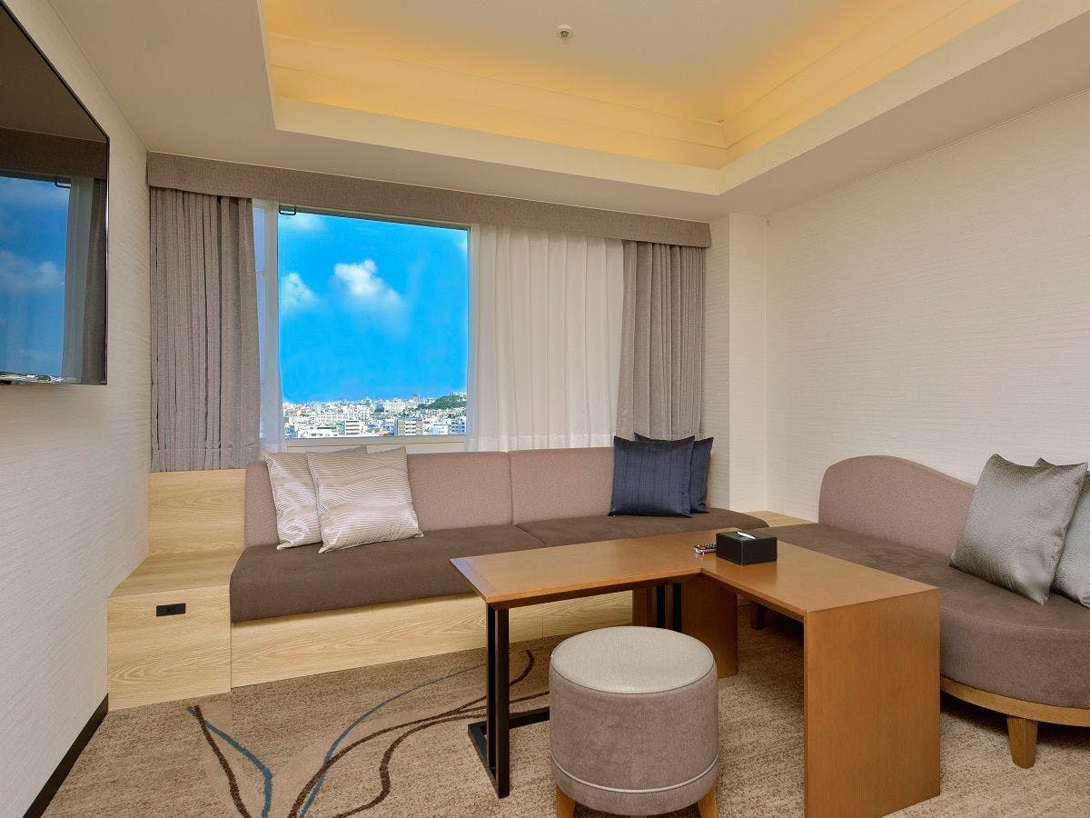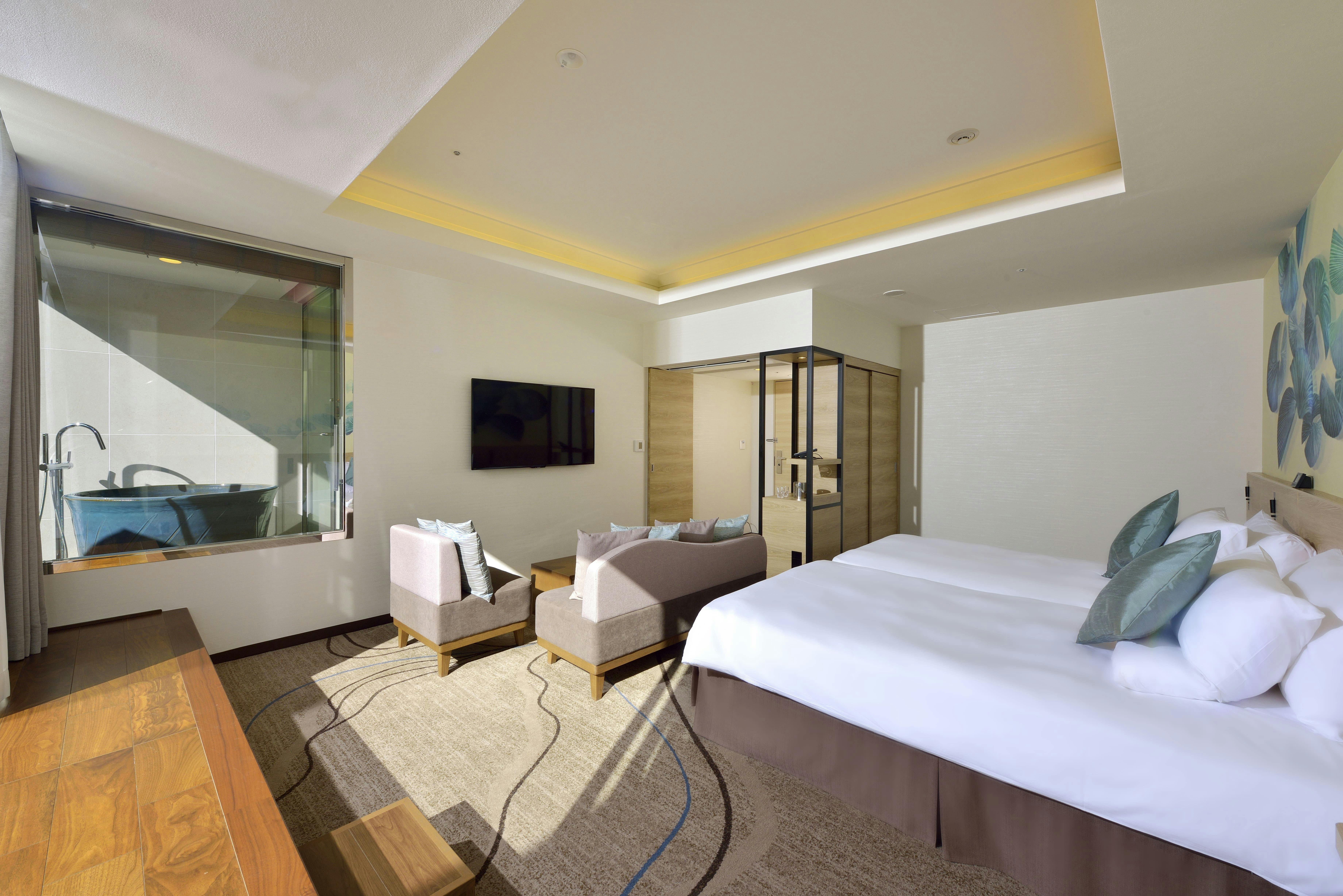 【最上階プレミアラウンジを無料でご利用頂けます】○ 全室無料Wi-Fi ○<広 さ>48平米+プライベートテラス30平米<ベッド>シモンズ社製<サイズ>幅120センチ×縦203センチ×2台 ※3名様以上でのご利用の場合スタッキングベッドをご用意致します。<バスルーム>レインシャワー、バス・トイレセパレート、洗い場付
