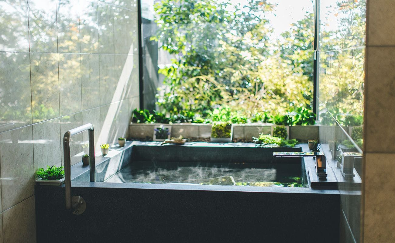 庭園をのぞむ開放的なテラス、広々とした檜風呂、